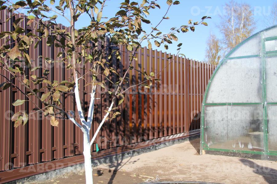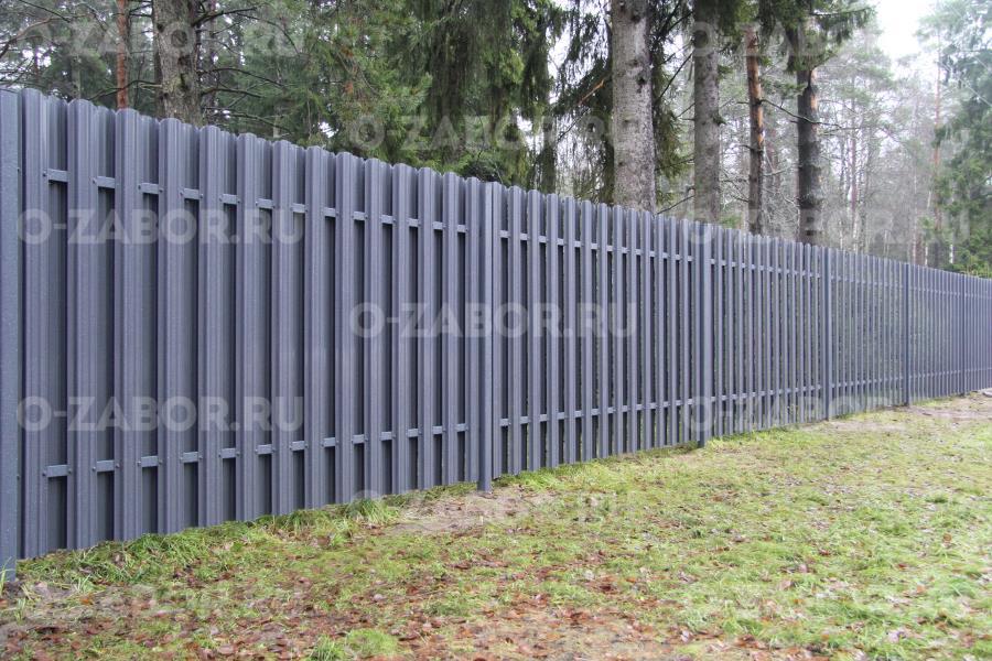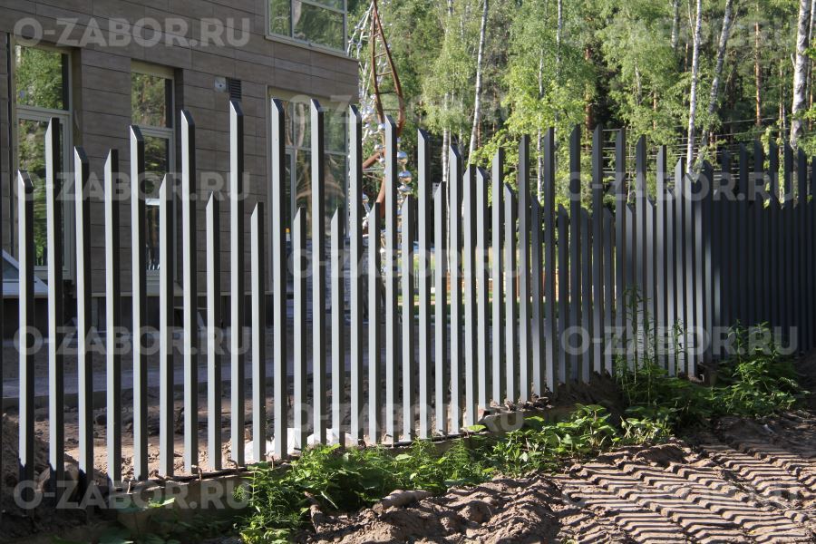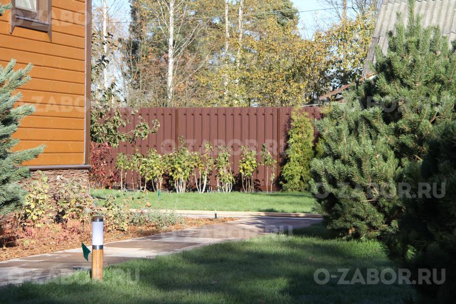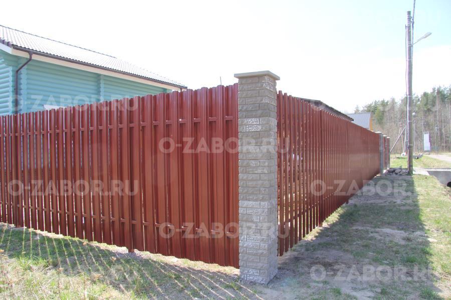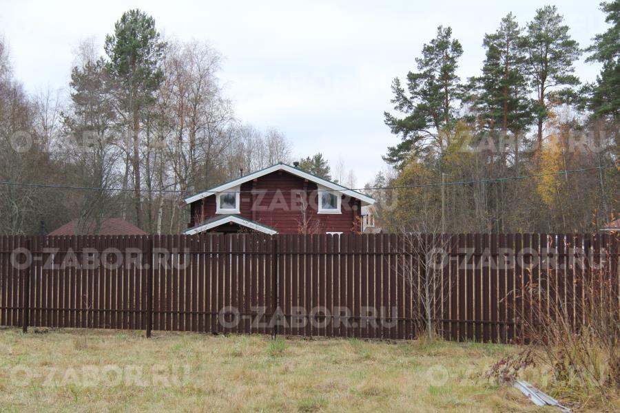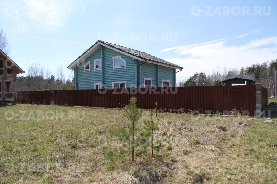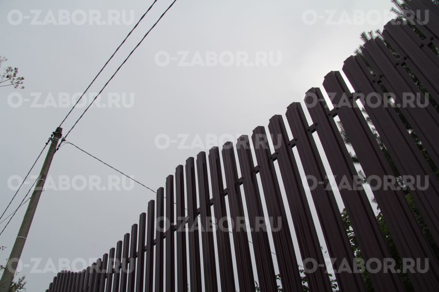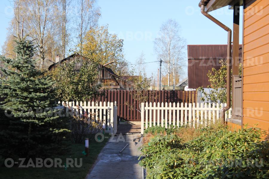 Длина периметра ограждения 170 метров. Штакетник шириной 120 мм, цвет RAL8017 в полимерном покрытии, зашивка с одной стороны с зазором 3 см.