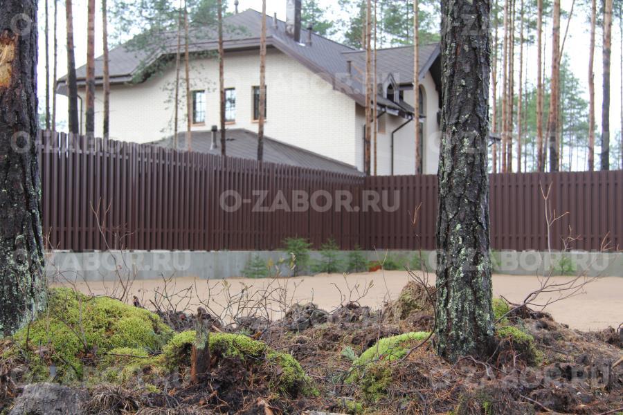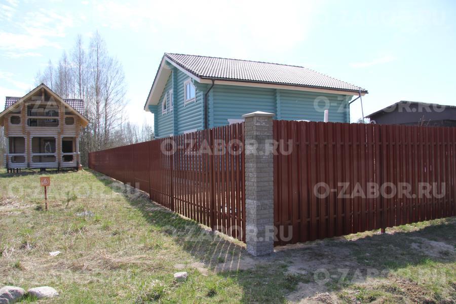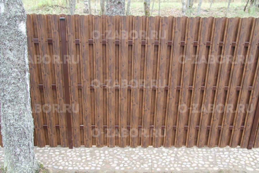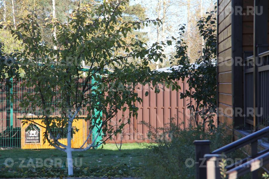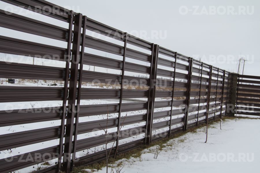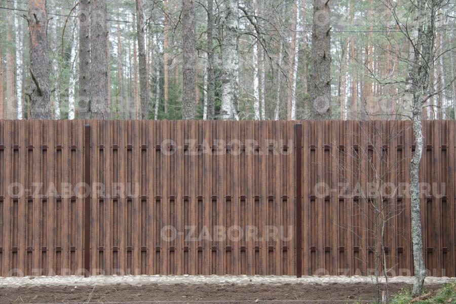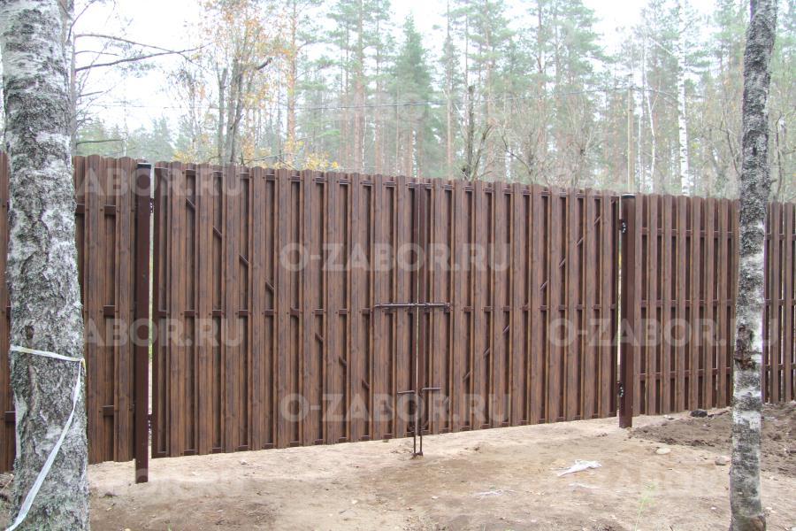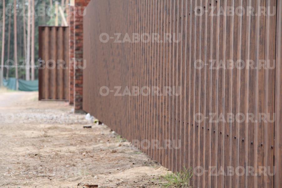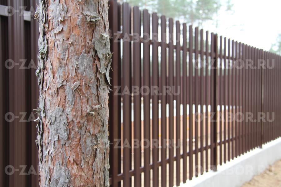 Длина периметра ограждения 170 метров. Штакетник шириной 120 мм, цвет RAL8017 в полимерном покрытии, зашивка с одной стороны с зазором 3 см.