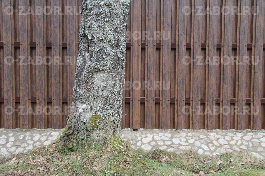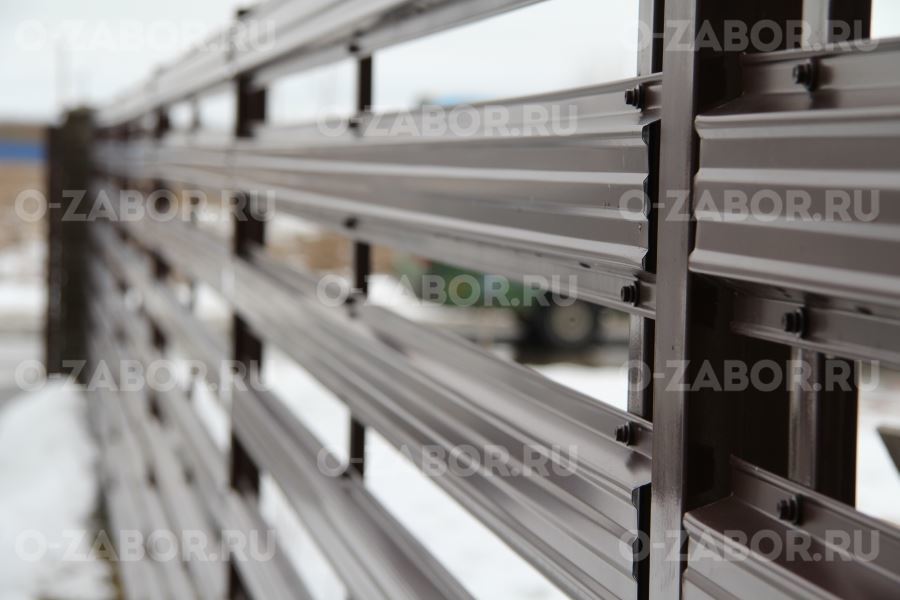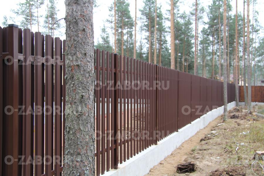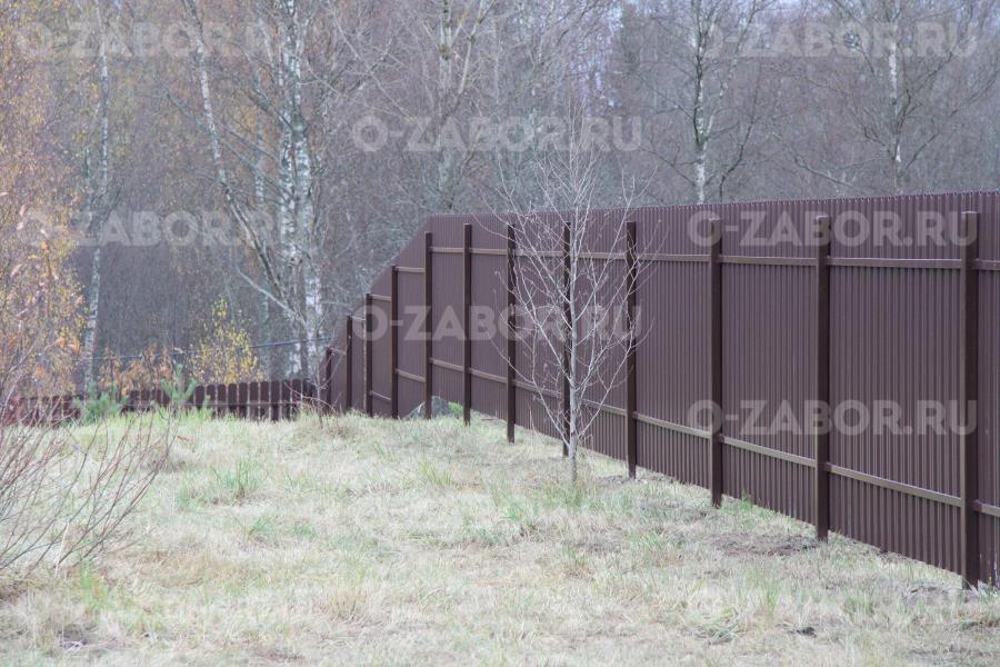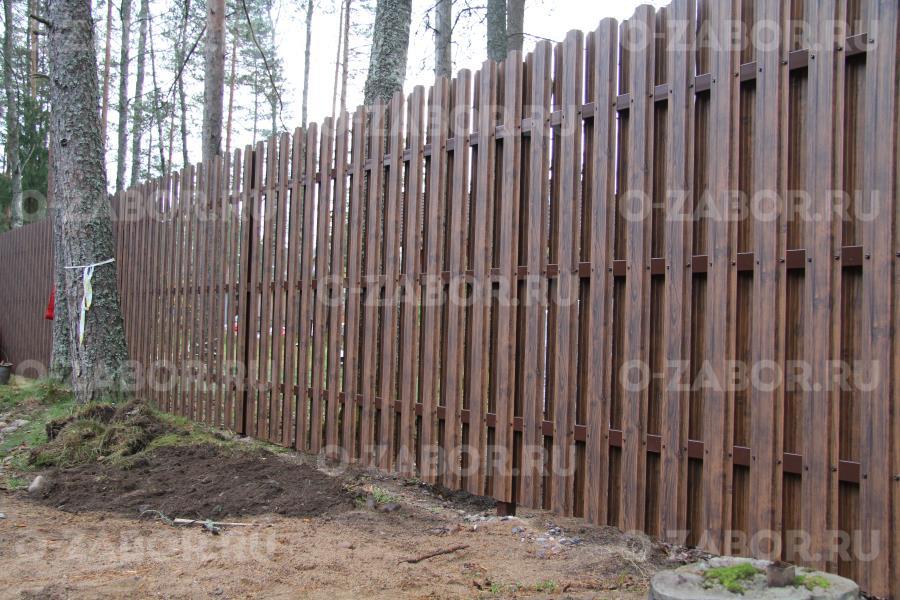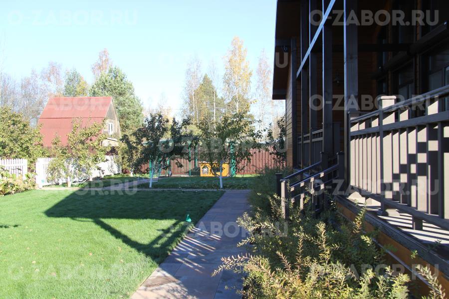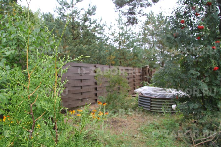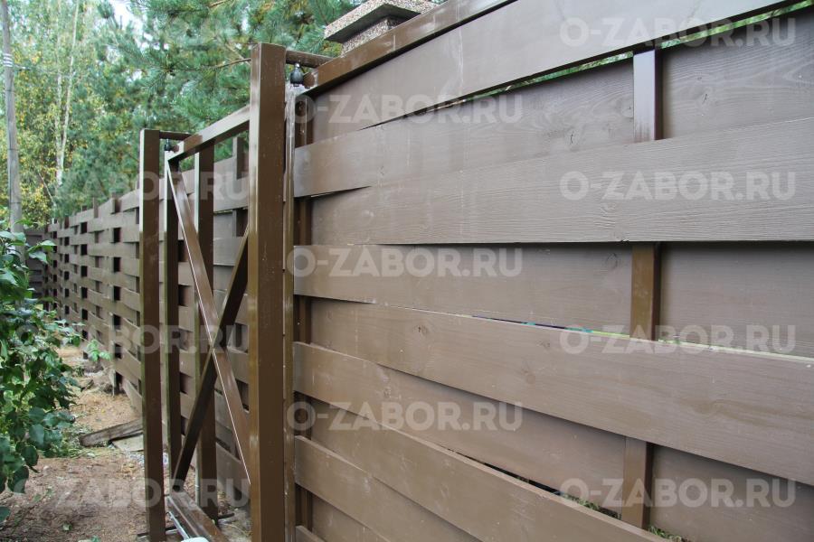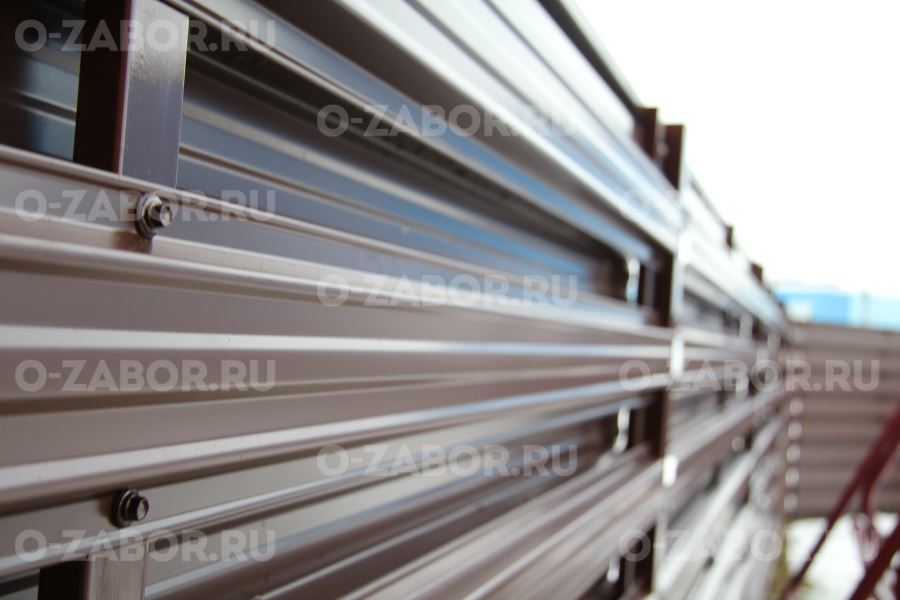 Длина периметра ограждения 170 метров. Штакетник шириной 120 мм, цвет RAL8017 в полимерном покрытии, зашивка с одной стороны с зазором 3 см.