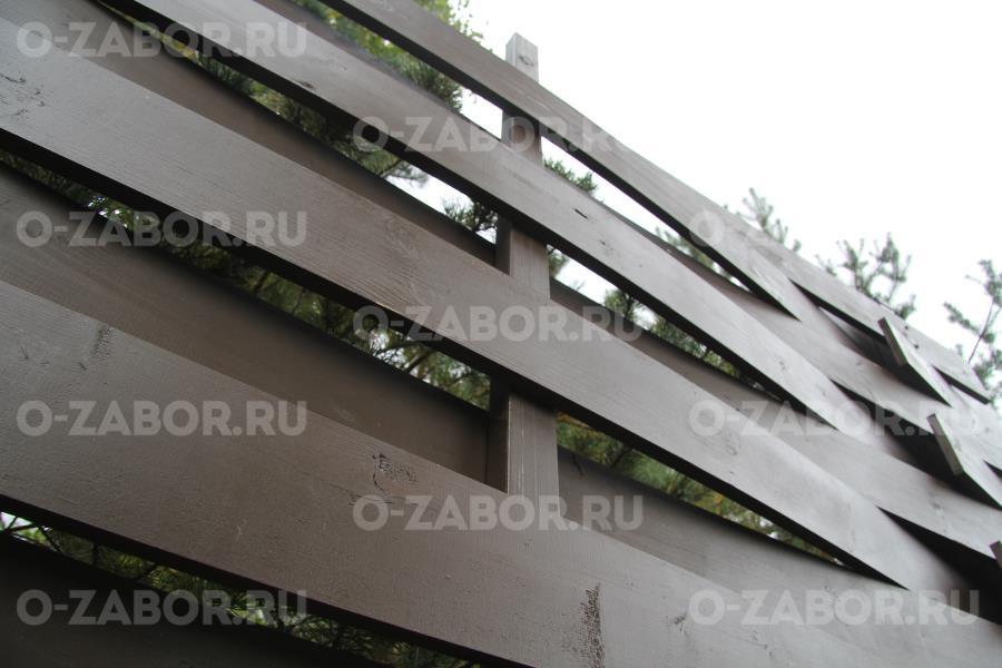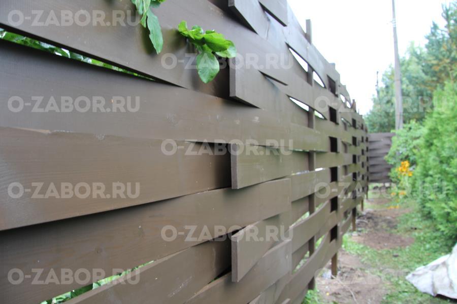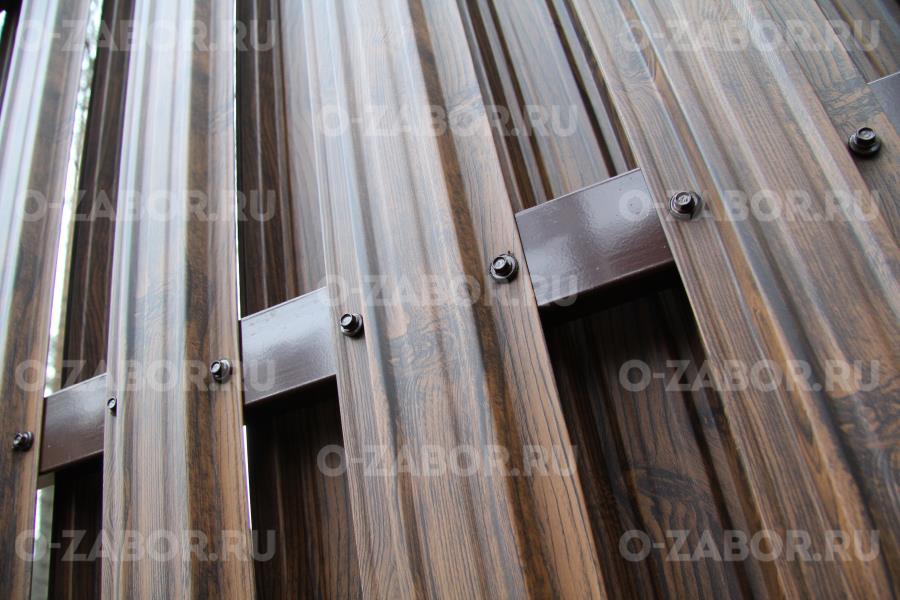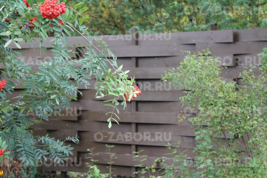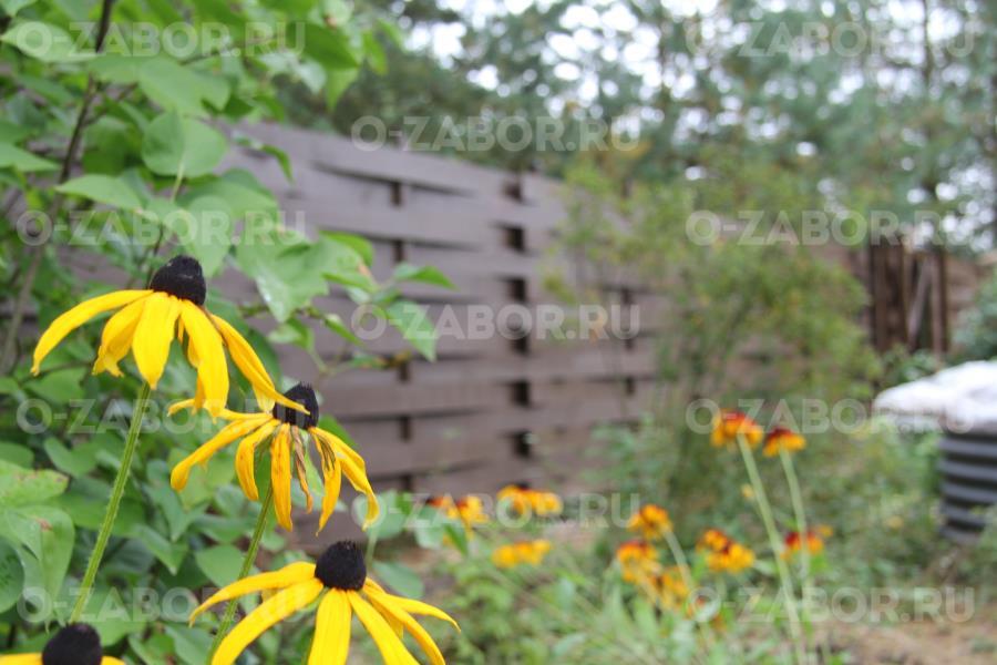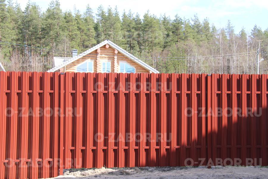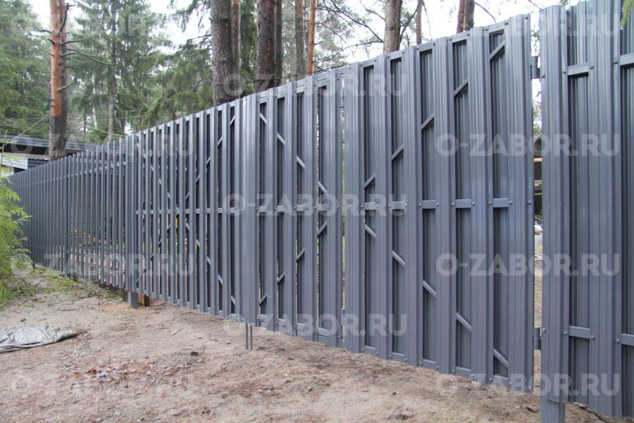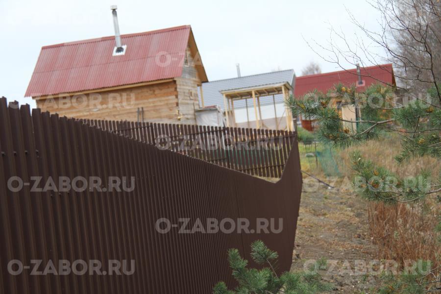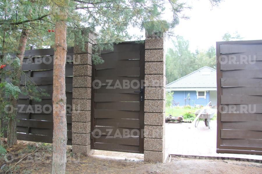 Длина периметра ограждения 170 метров. Штакетник шириной 120 мм, цвет RAL8017 в полимерном покрытии, зашивка с одной стороны с зазором 3 см.