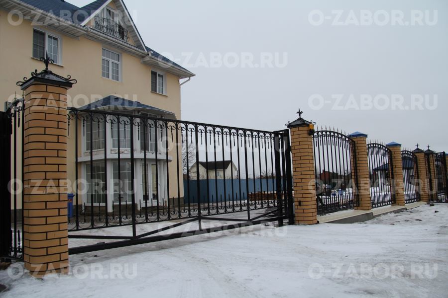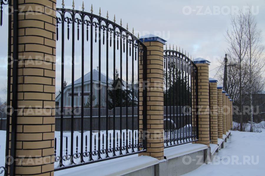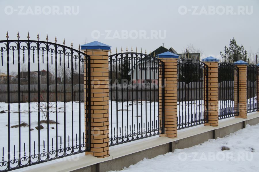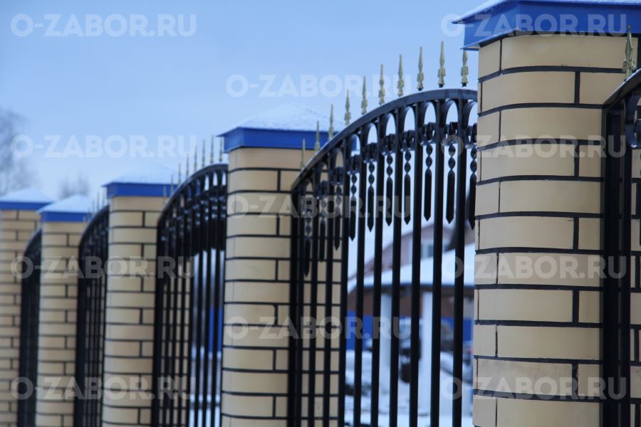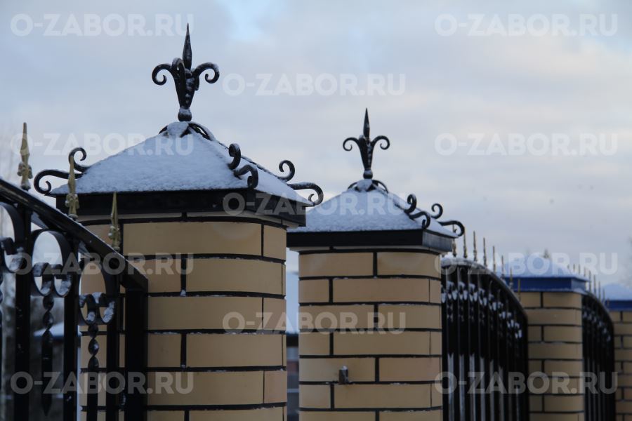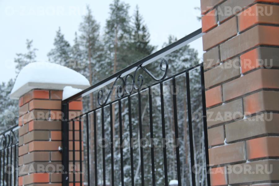 Кирпичные столбы янтарного цвета, ковка в черном порошковом покрытии. По всей длине лента.