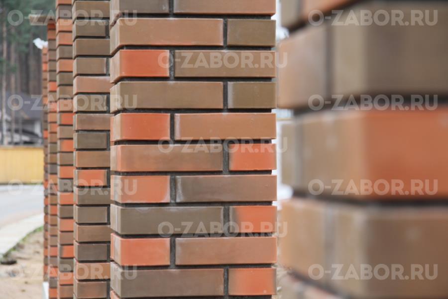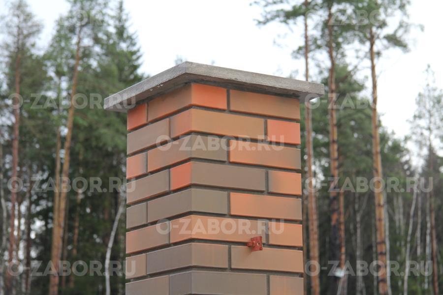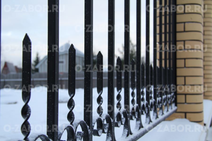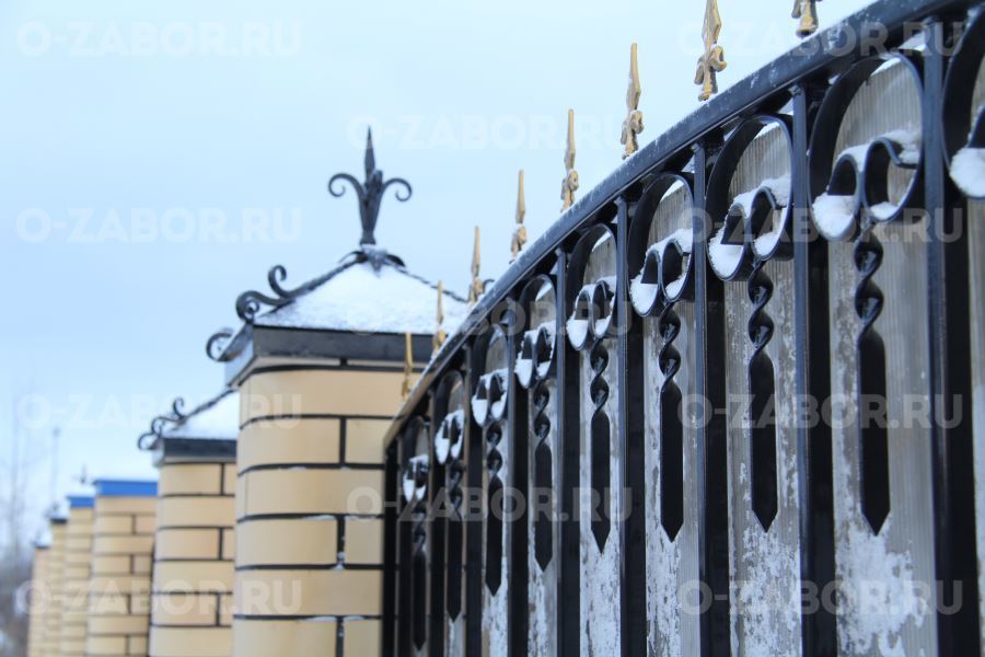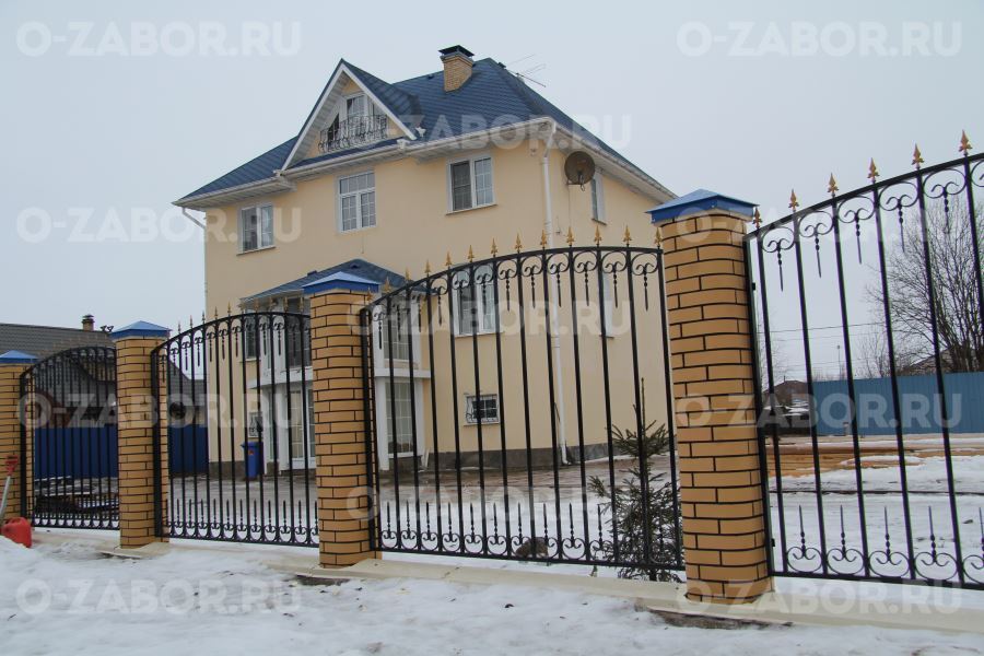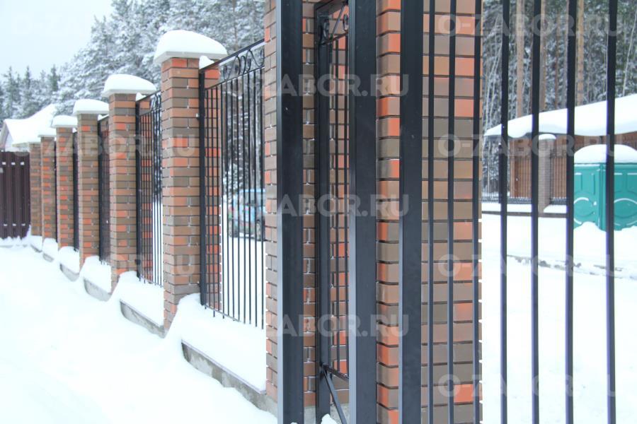 Кирпичные столбы янтарного цвета, ковка в черном порошковом покрытии. По всей длине лента.