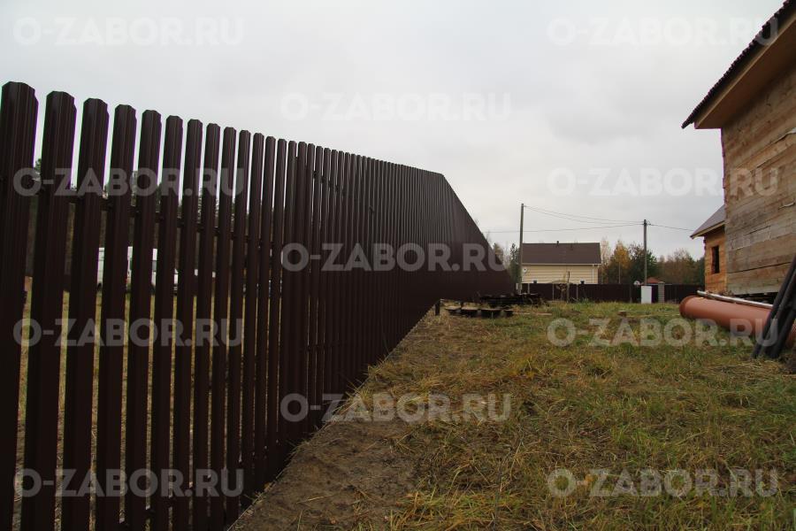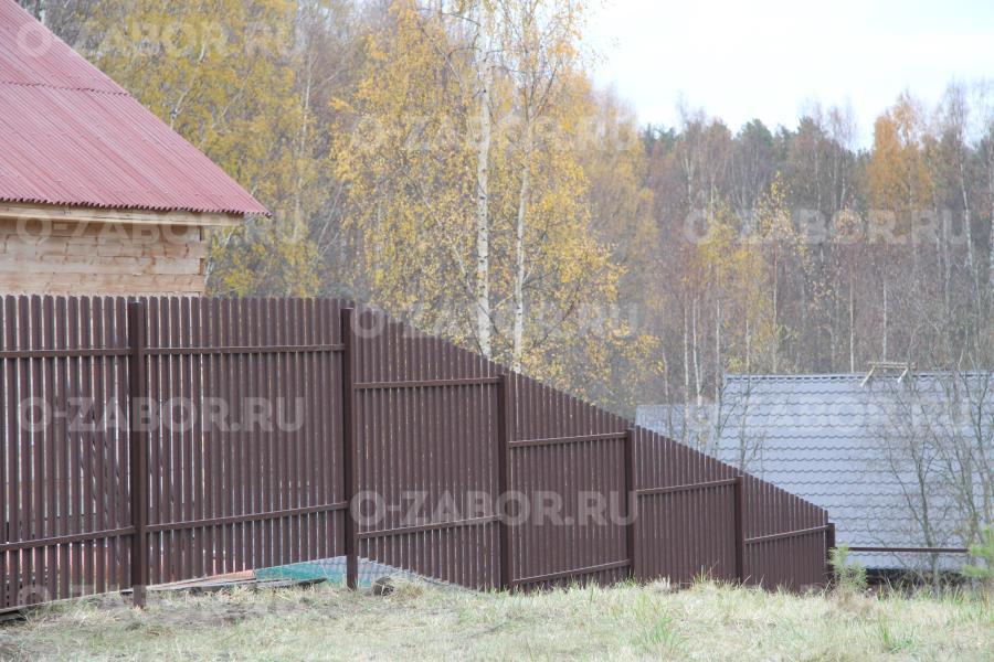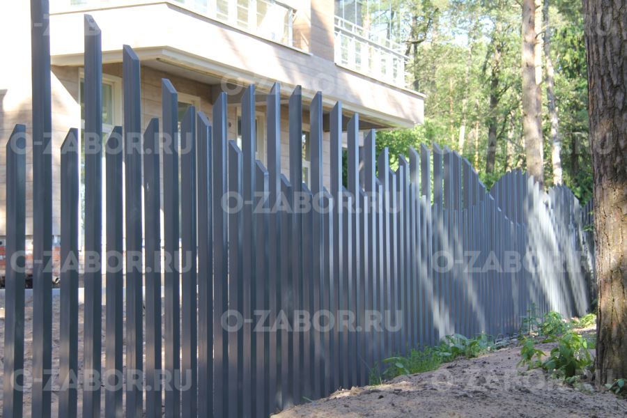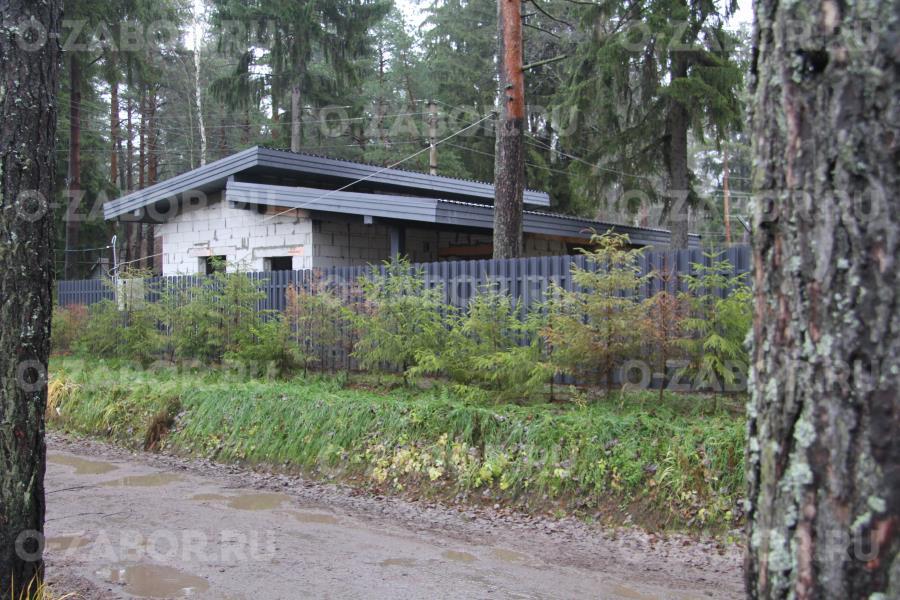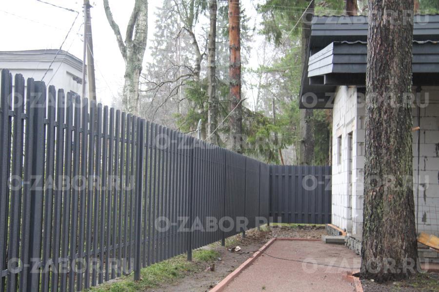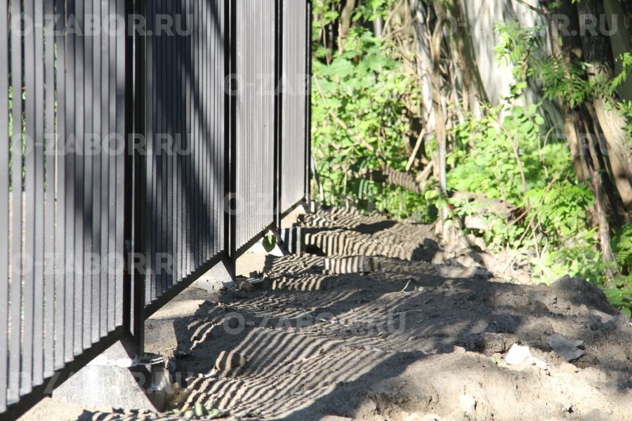 Длина забора 70 метров. Штакетник шириной 120 мм, высотой 1,75 до 2,05 метров, покрытие порошковое RAL4007.