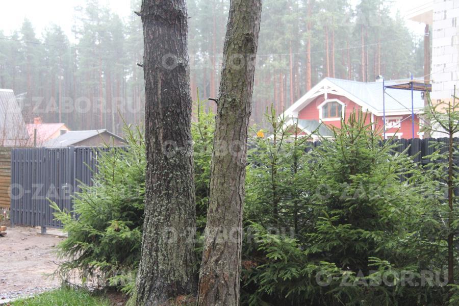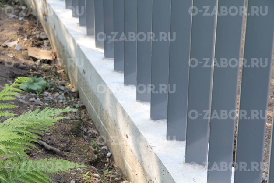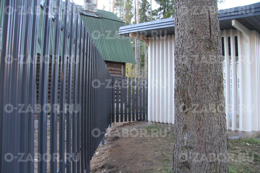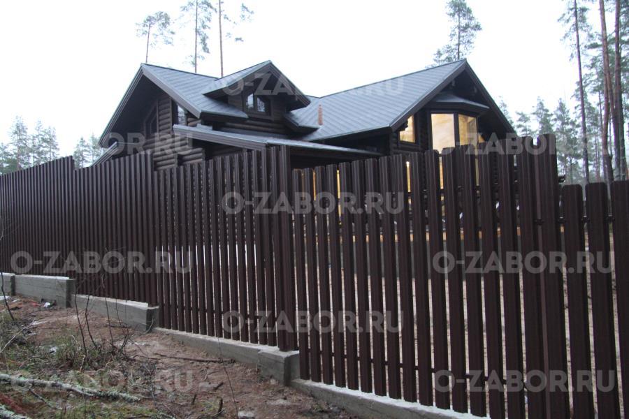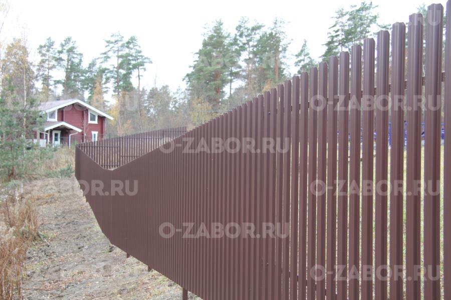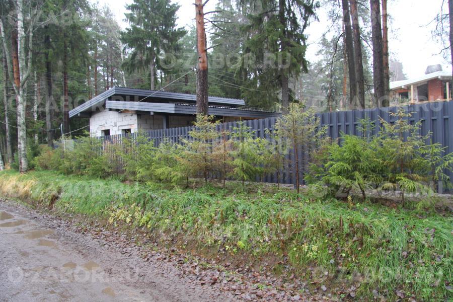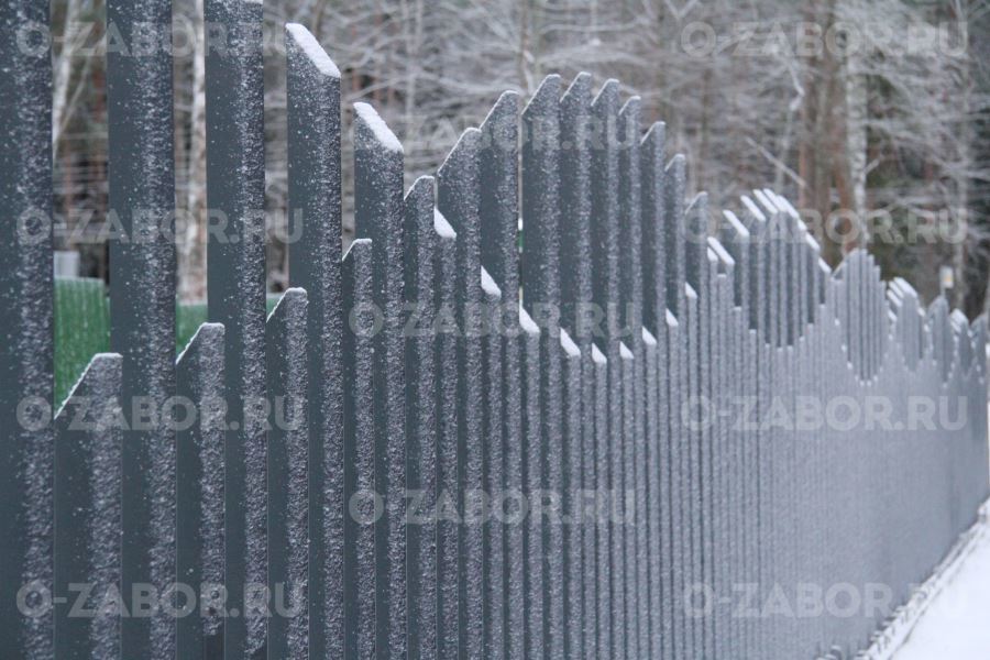 Длина забора 70 метров. Штакетник шириной 120 мм, высотой 1,75 до 2,05 метров, покрытие порошковое RAL4007.