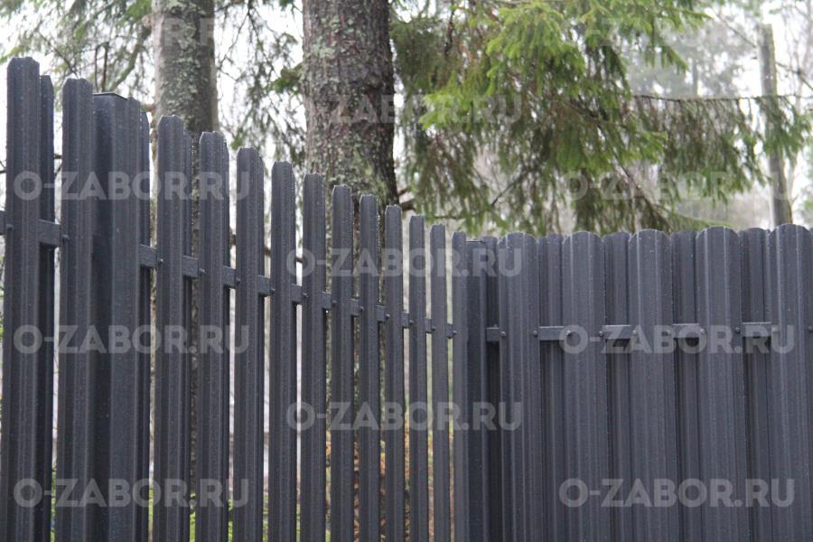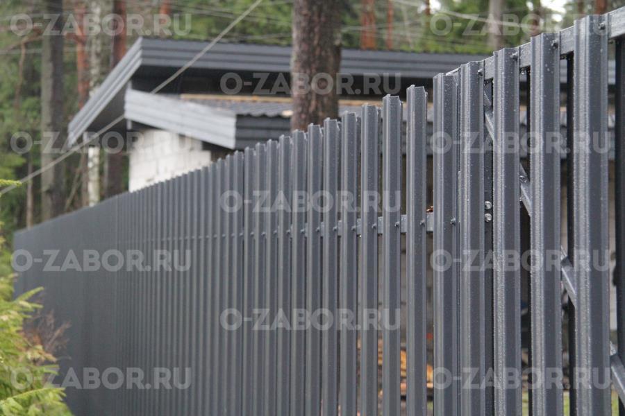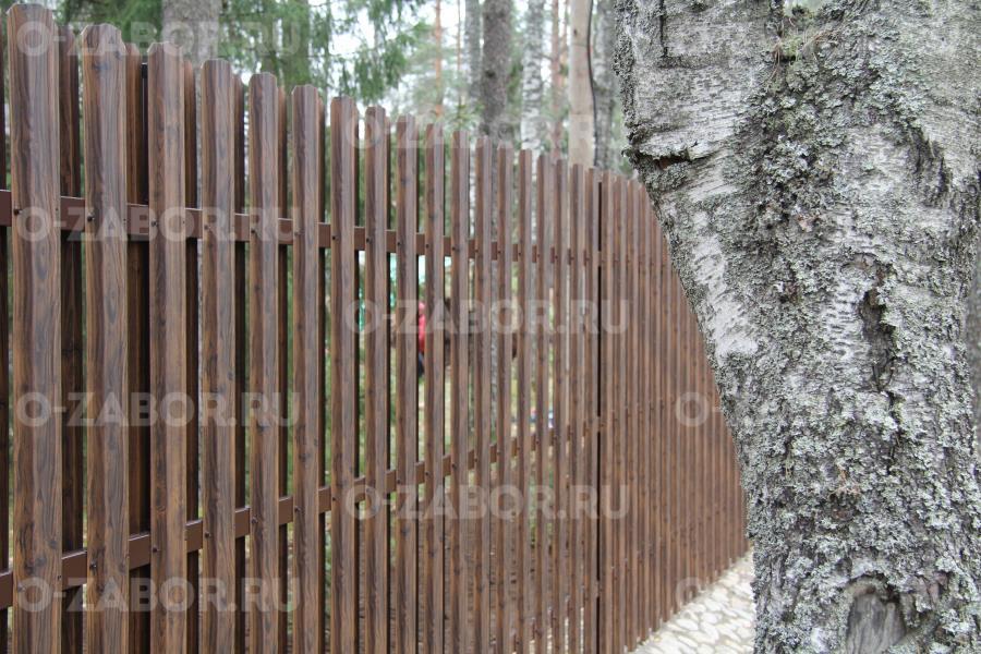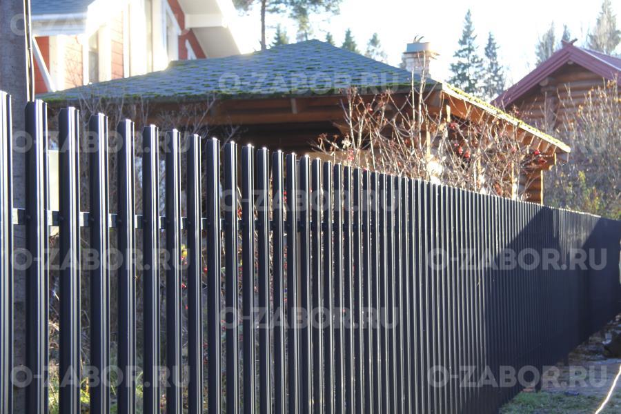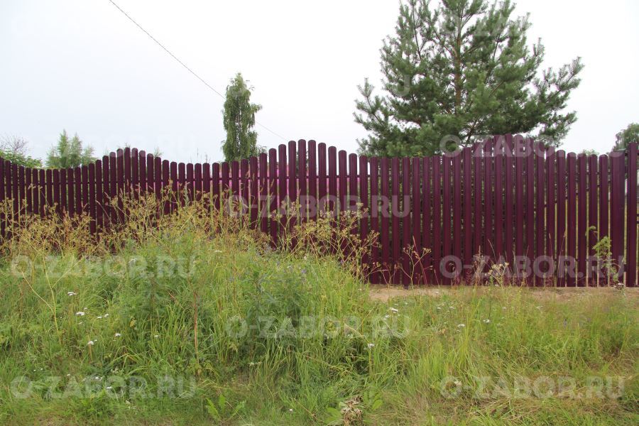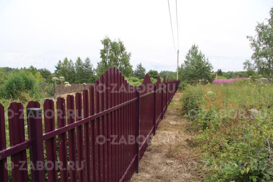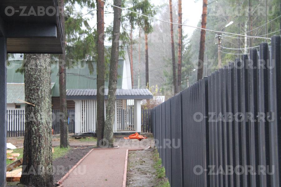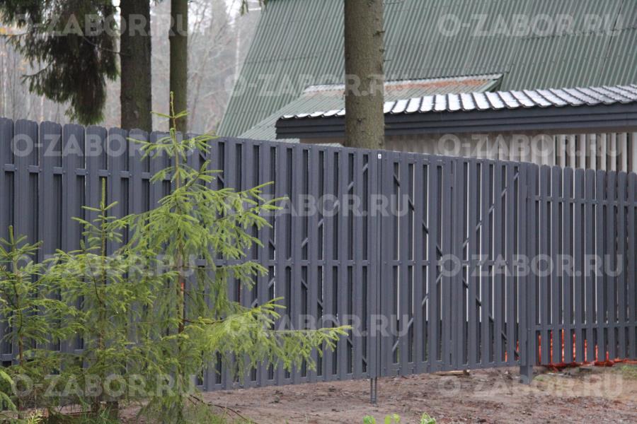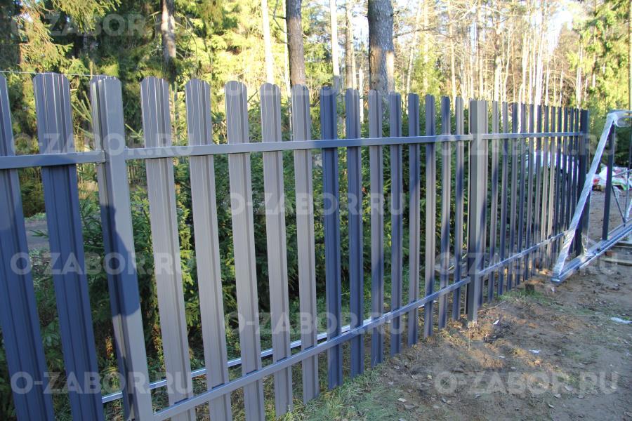 Длина забора 110 метра. Штакетник шириной 120 мм, высотой 1,8 метра, покрытие полимерное RAL8017.