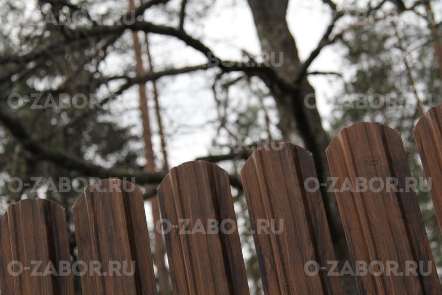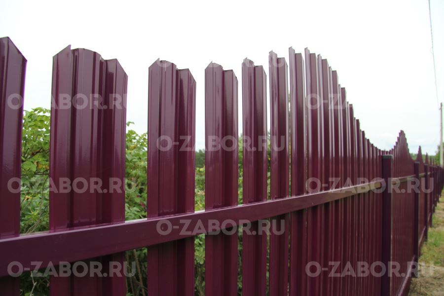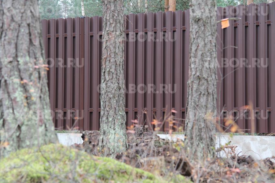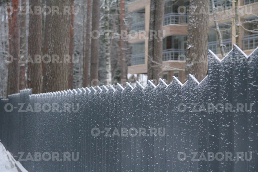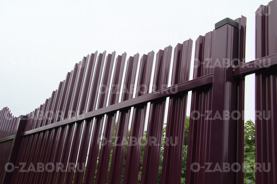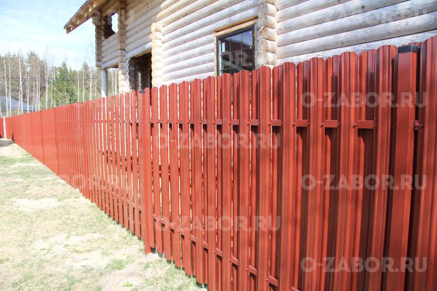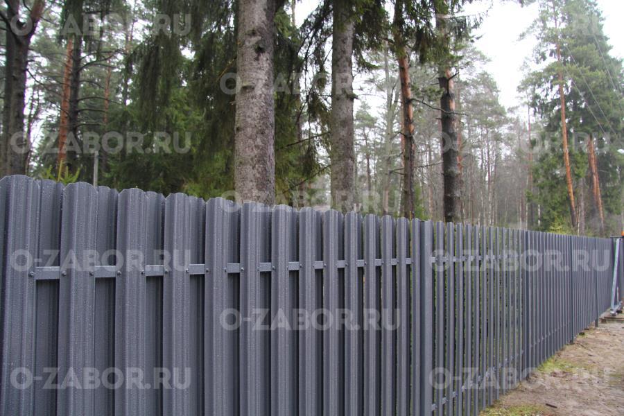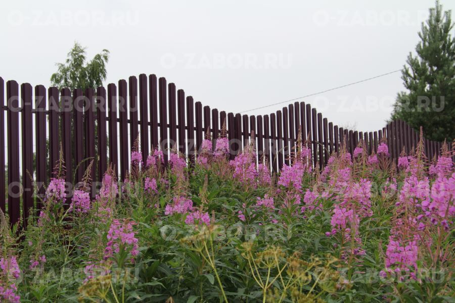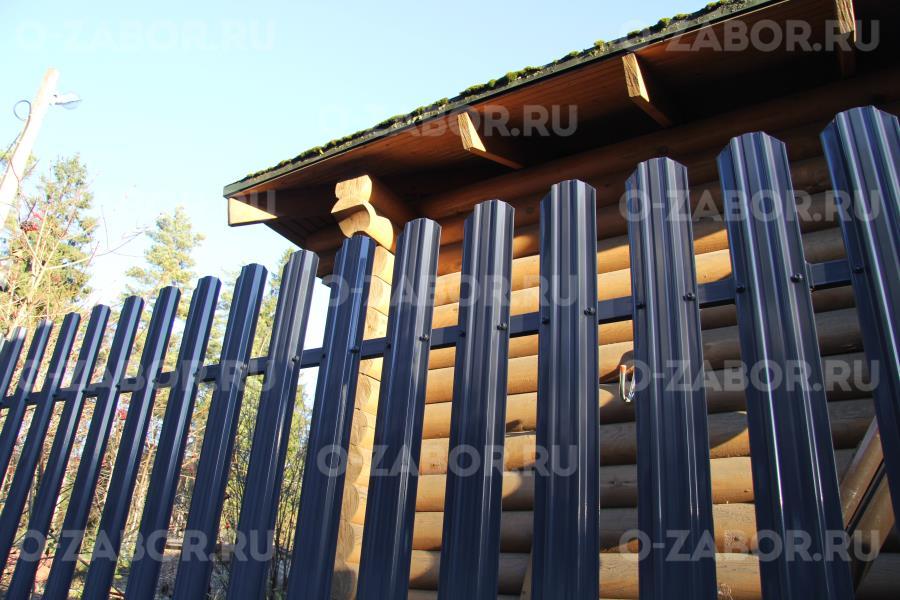 Длина забора 110 метра. Штакетник шириной 120 мм, высотой 1,8 метра, покрытие полимерное RAL8017.