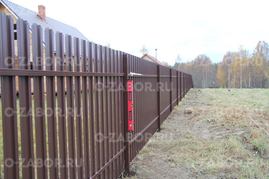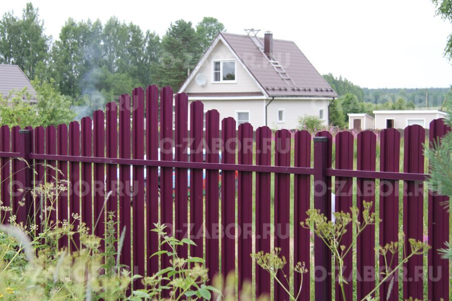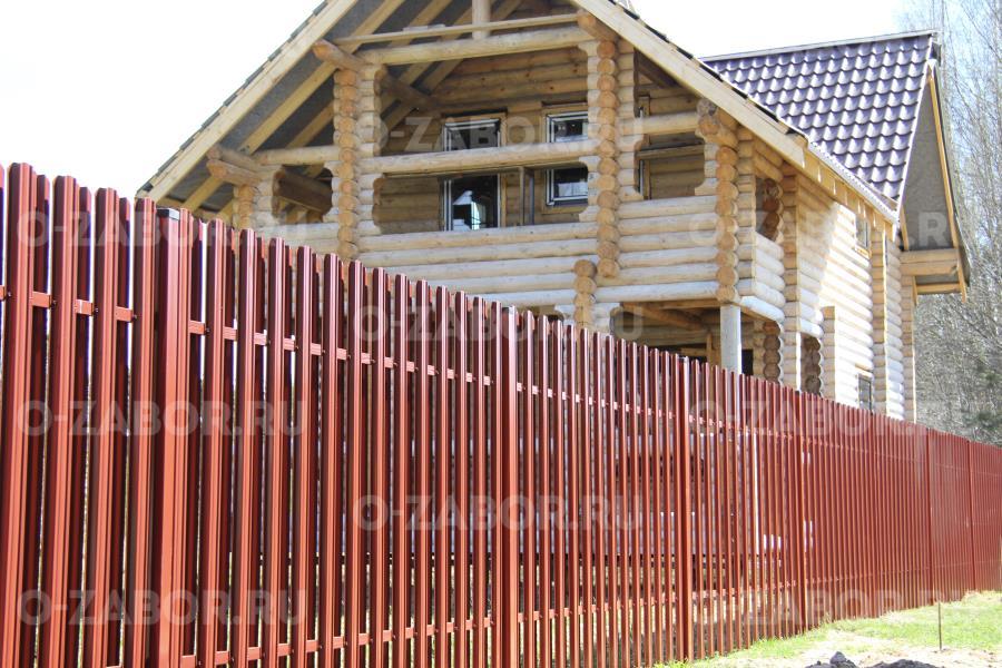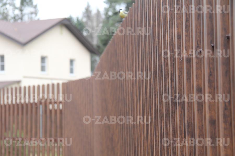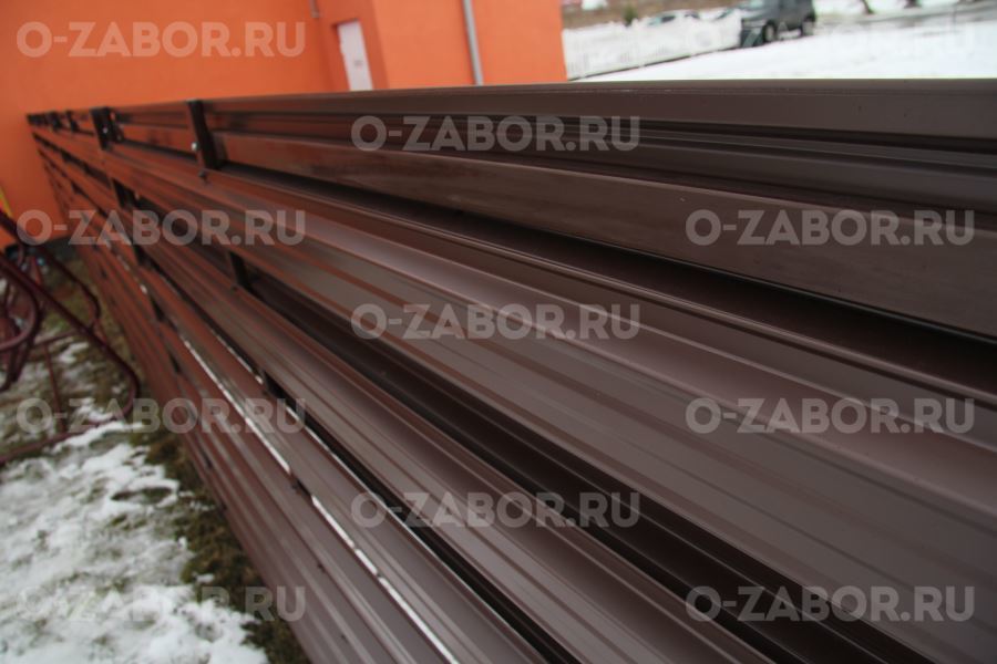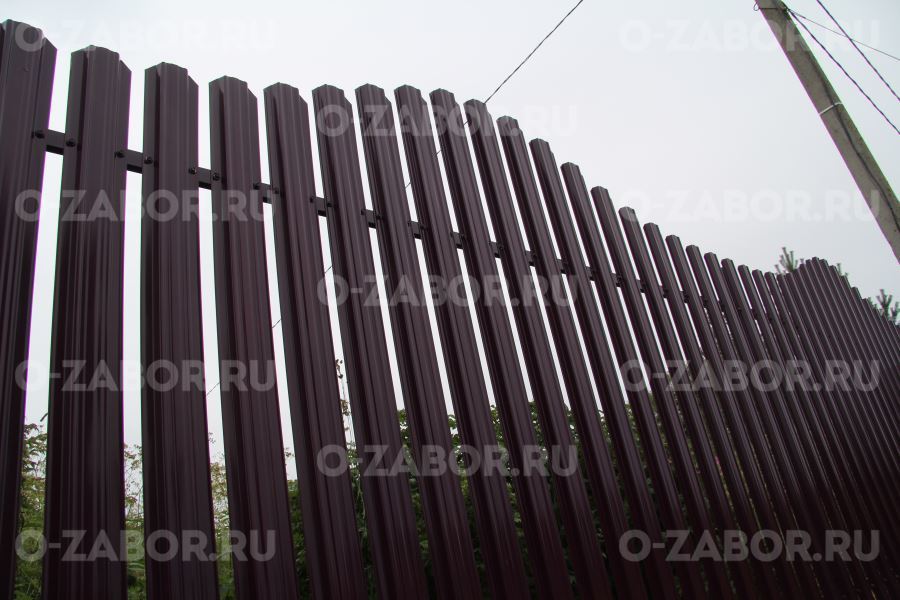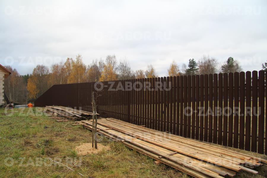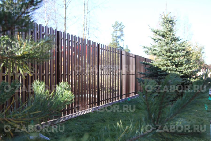 Длина забора 65 метров. Штакетник шириной 136 мм, длиной по 3 метра, покрытие полимерное RAL8017.