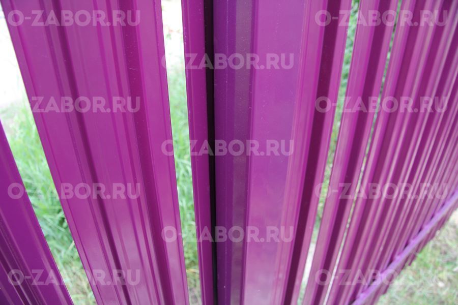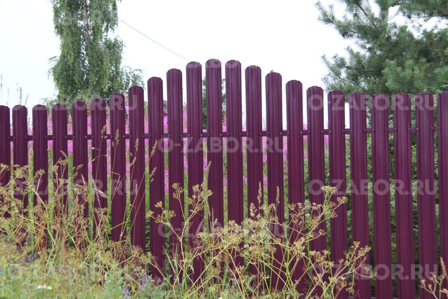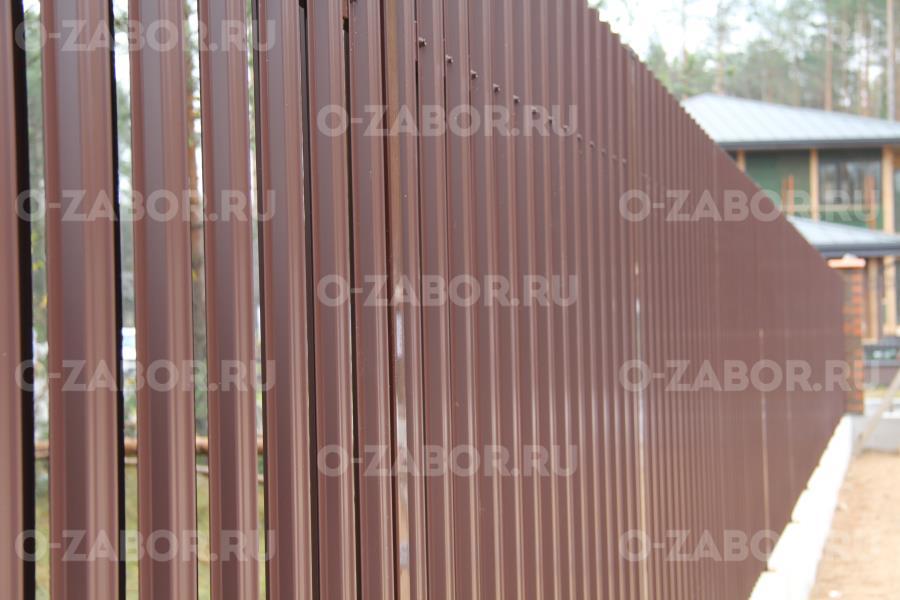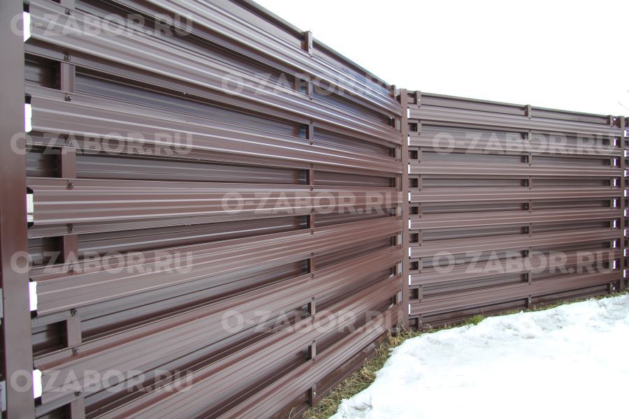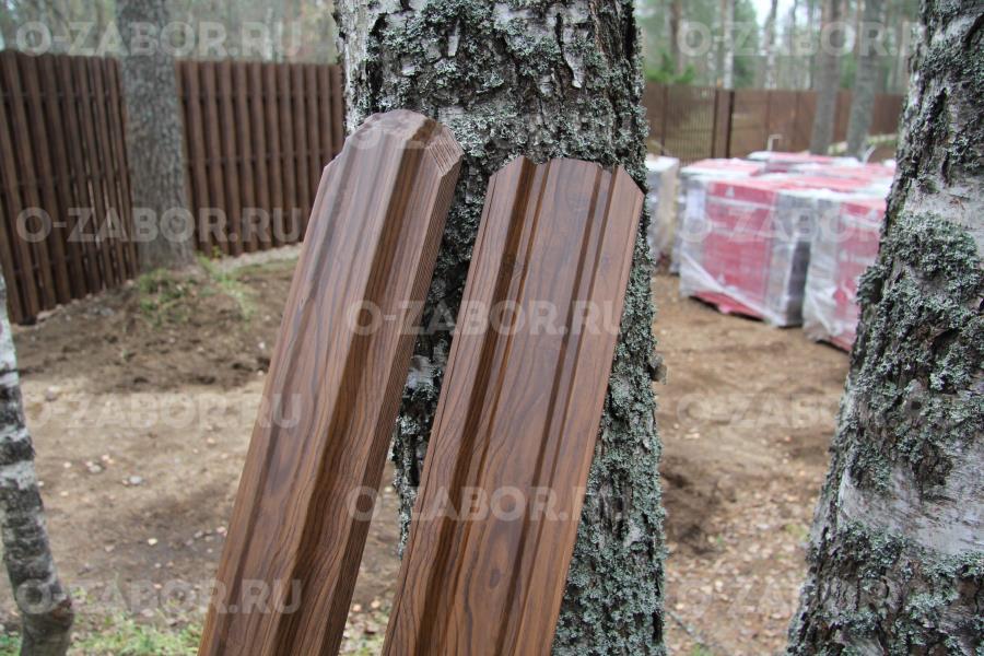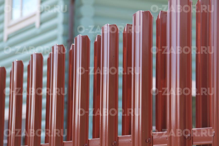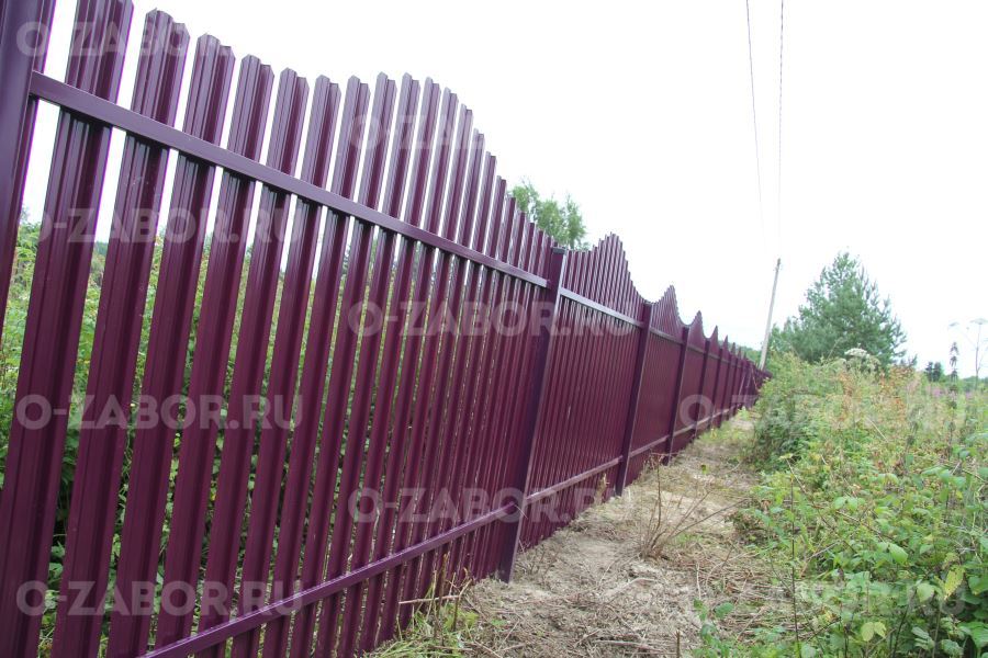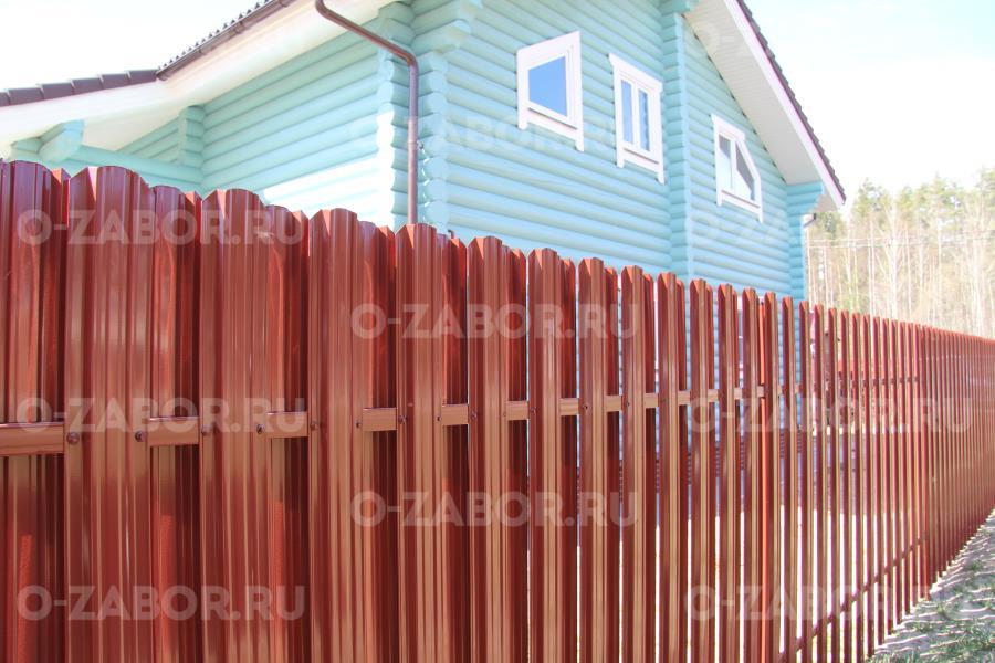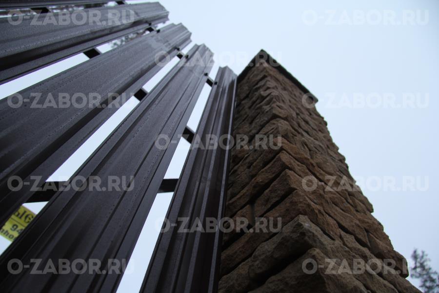 Длина забора 65 метров. Штакетник шириной 136 мм, длиной по 3 метра, покрытие полимерное RAL8017.