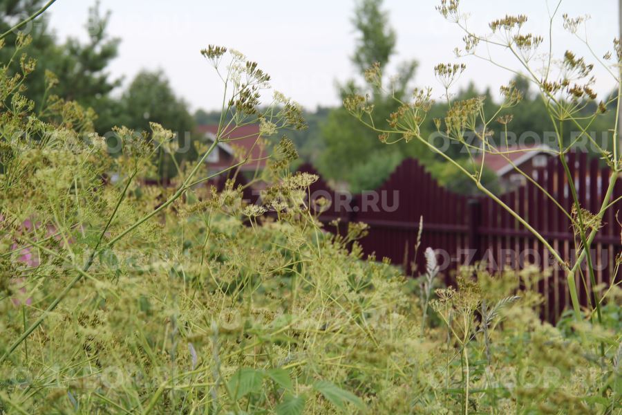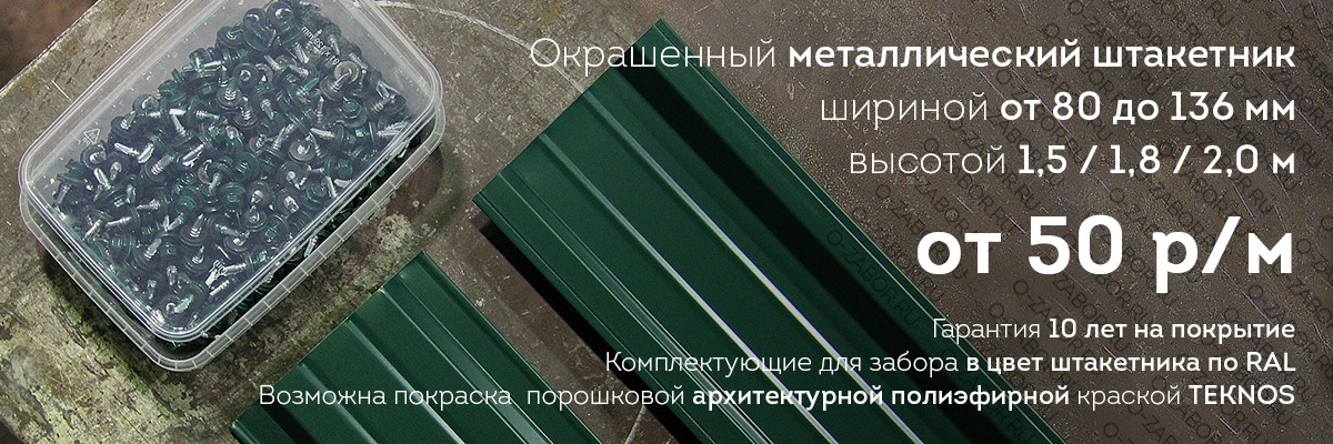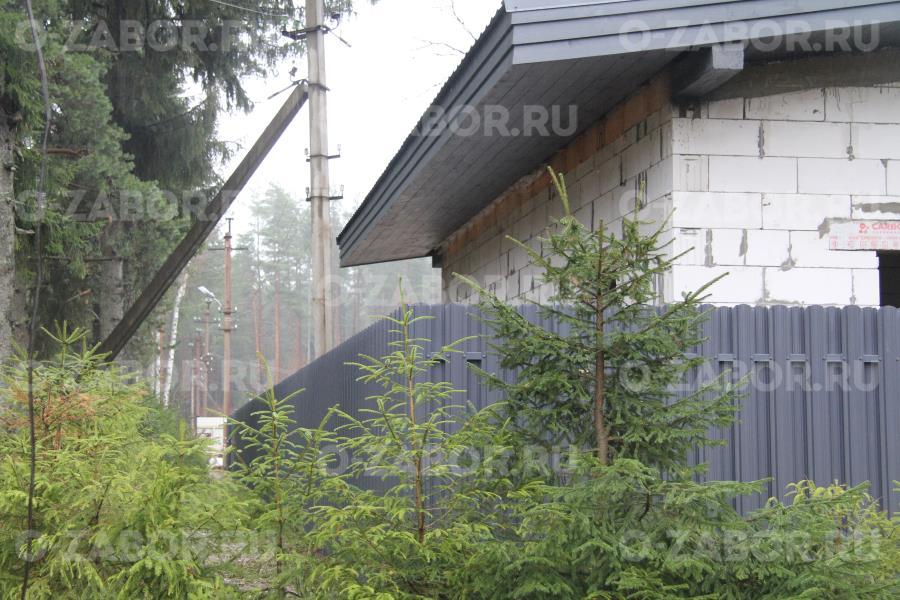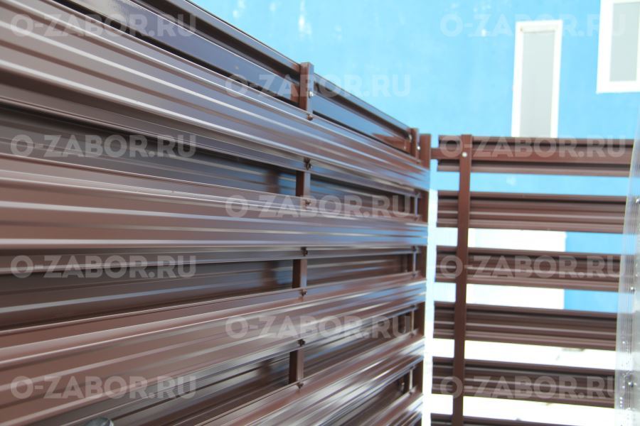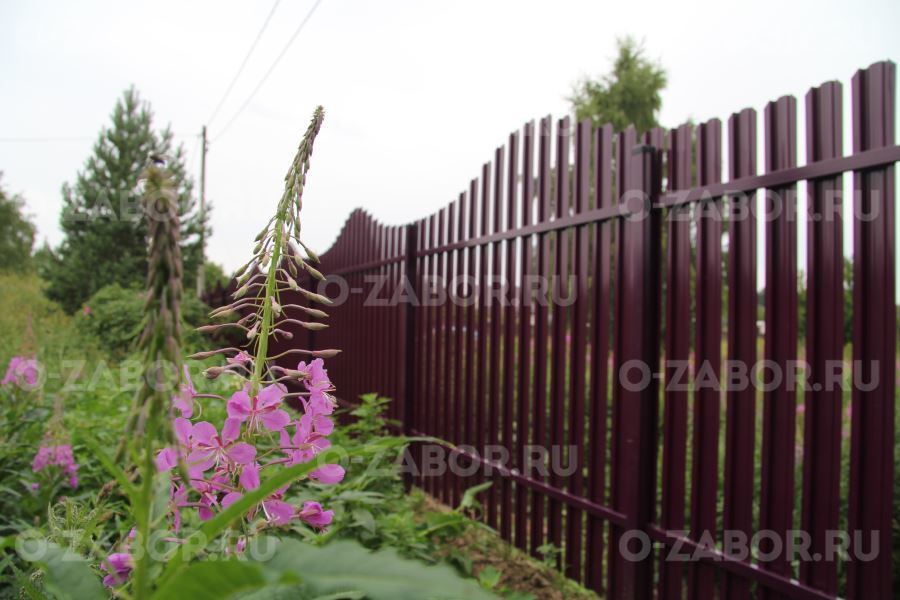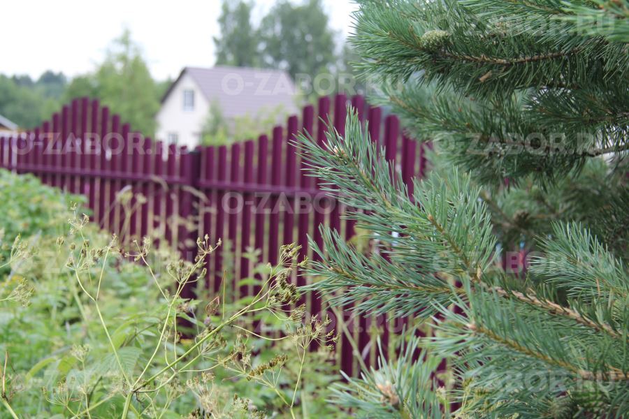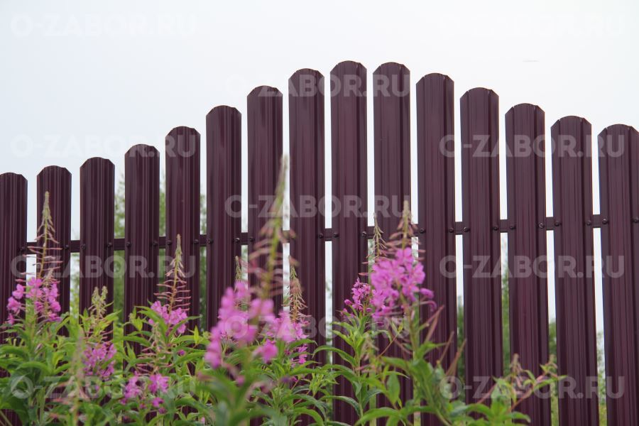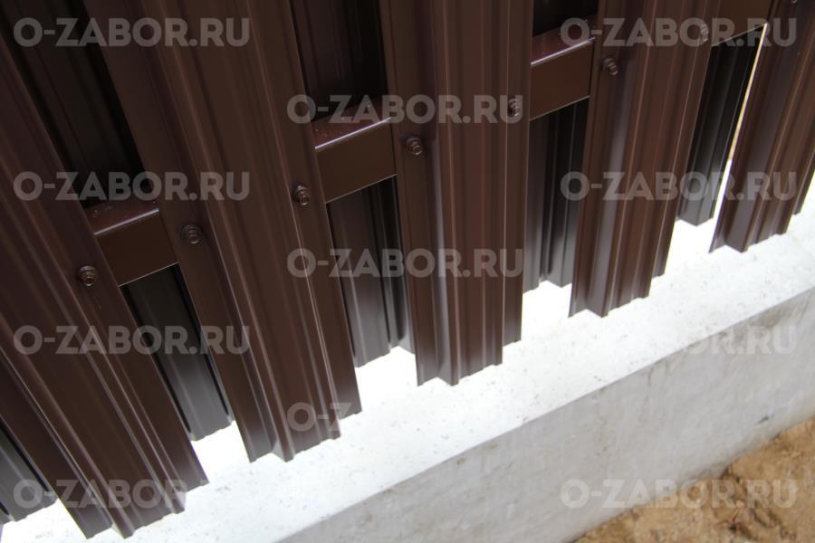 Длина забора 65 метров. Штакетник шириной 136 мм, длиной по 3 метра, покрытие полимерное RAL8017.