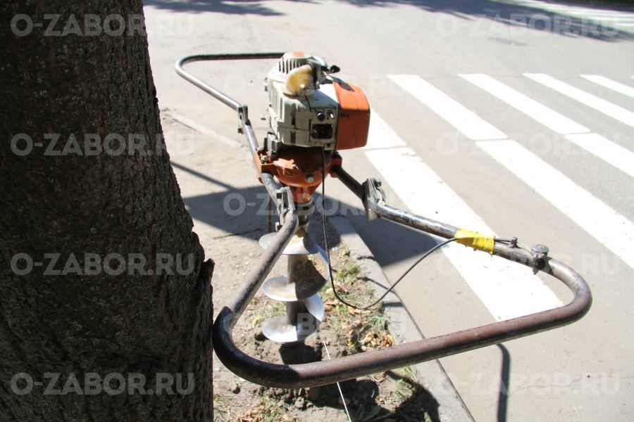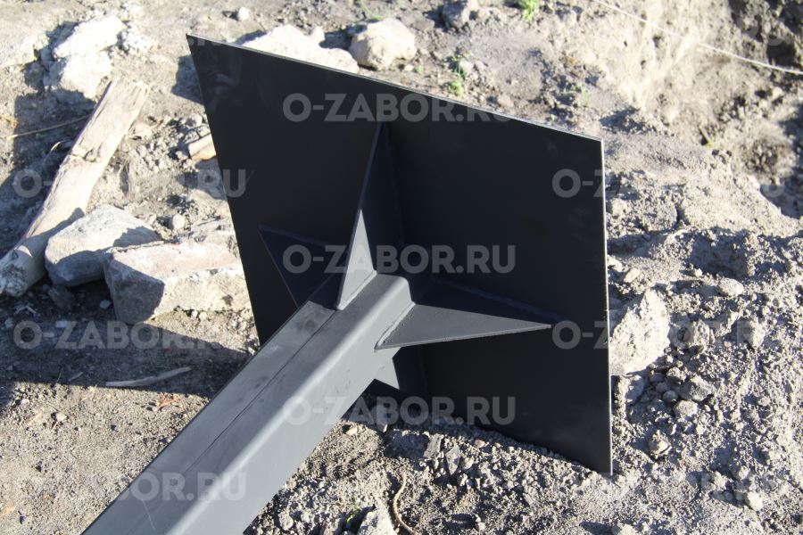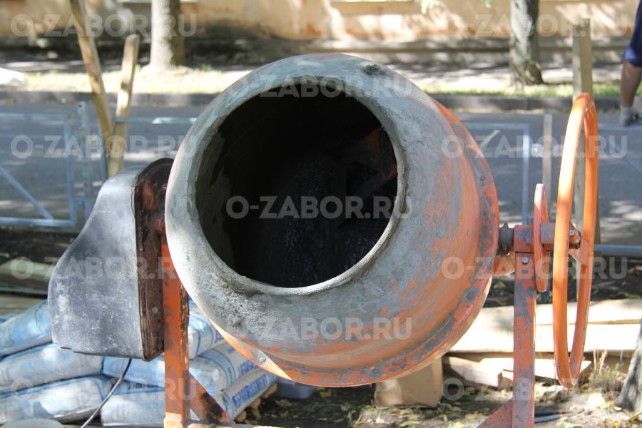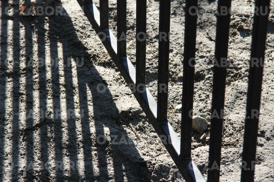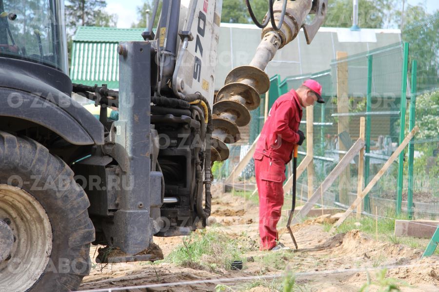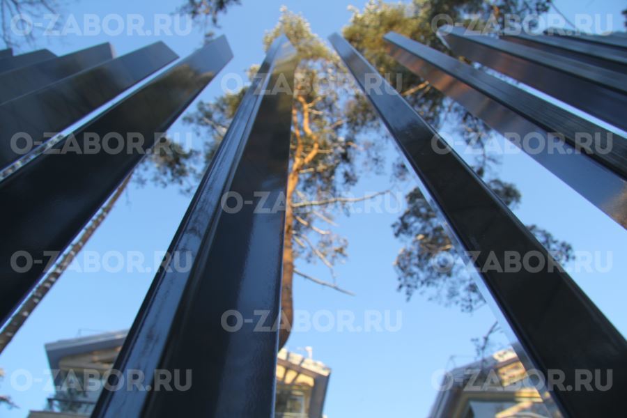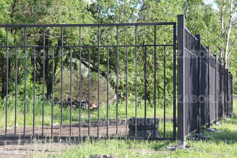 Длина забора 400 метров, двое ворот и калитка. Секции по 3 метра из профильных труб 40х40 и 20х20 мм, огрунтованы и окрашены в черный матовый. Столбы 100х100 мм на прочном двух-составном фундаменте диаметром до 600 мм. Местами глубина фундамента составляет 2,2 метра.