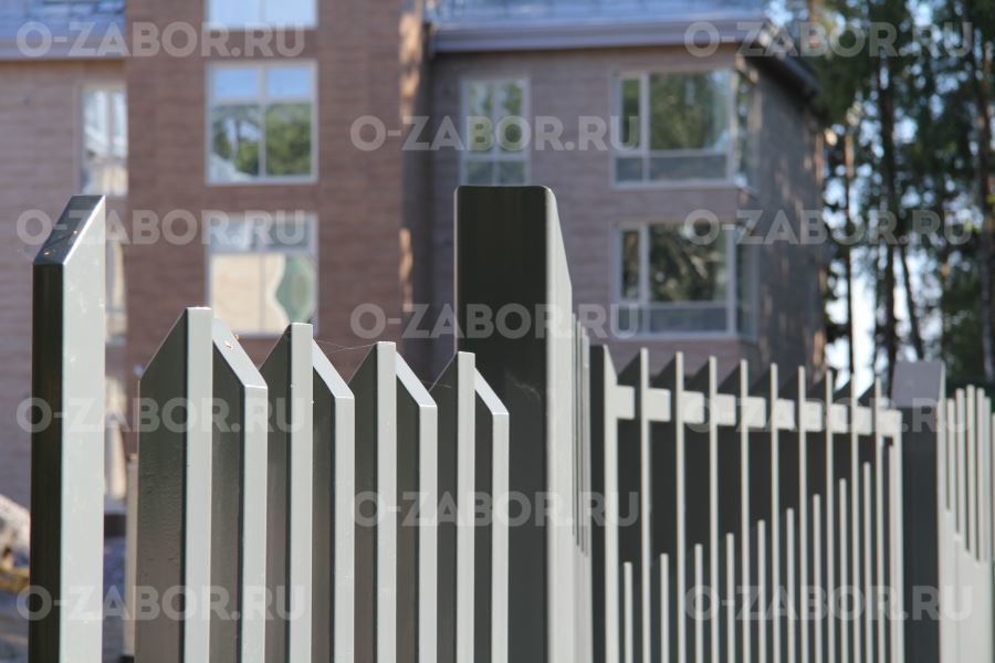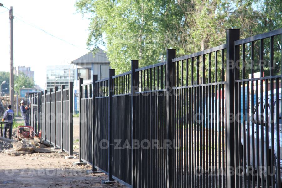 Классический сварной забор для городских улиц впечатляет своей регулярностью.