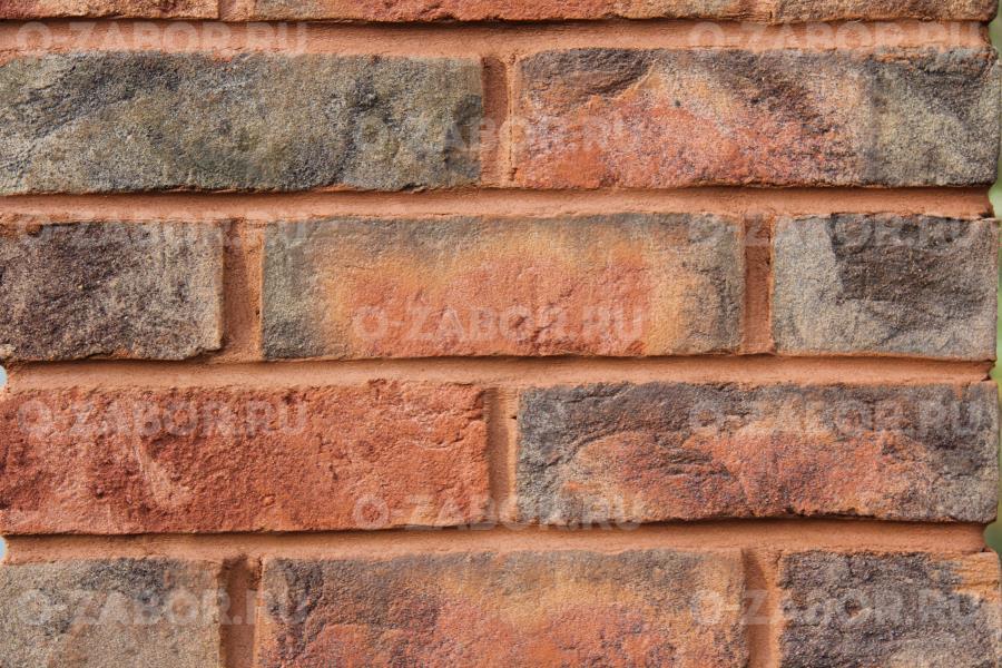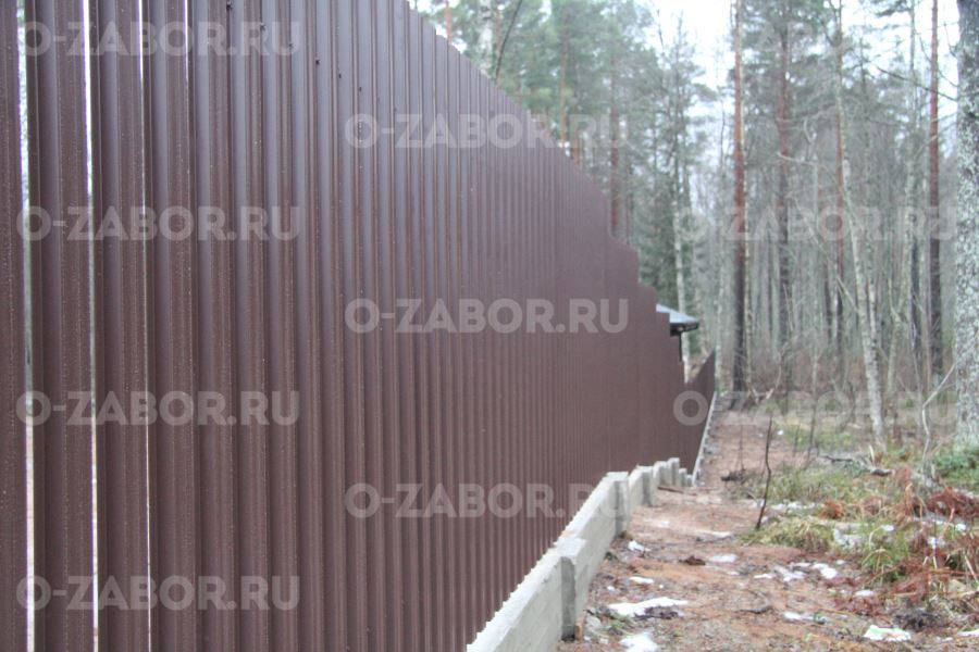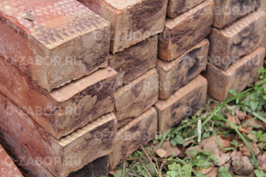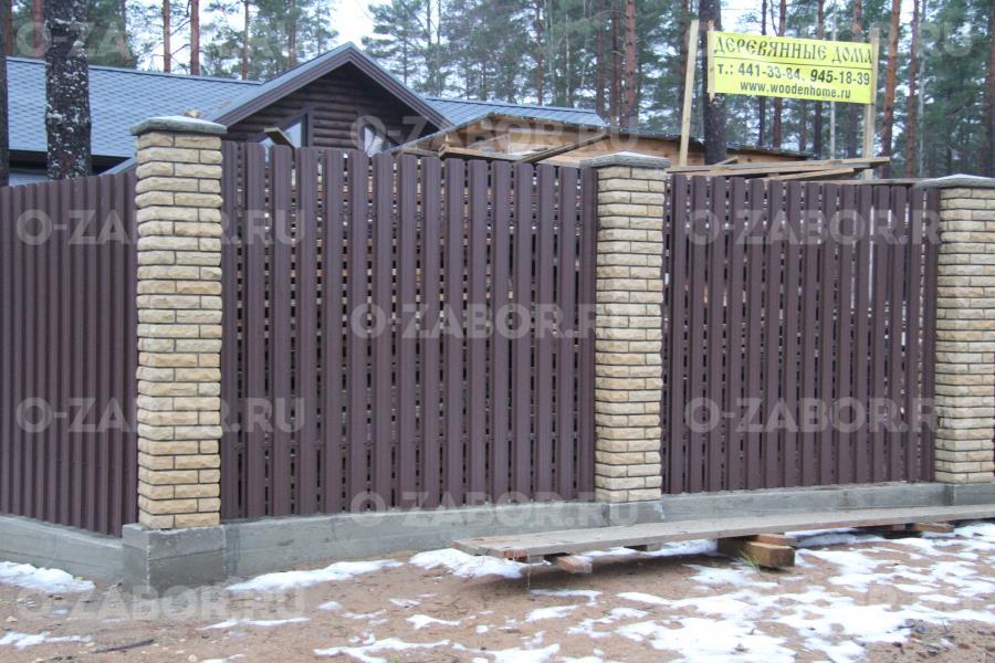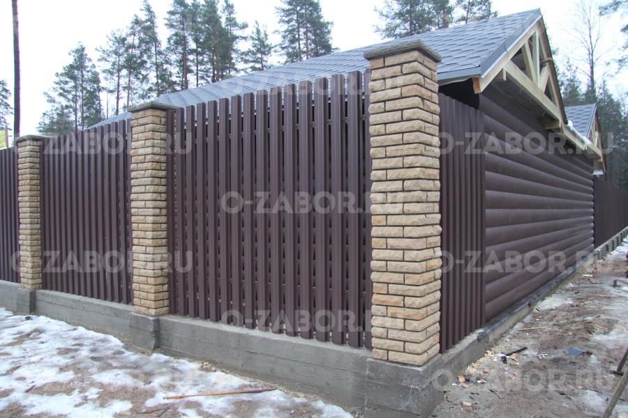 Классический забор на бетонной ленте с колотыми кирпичами.
