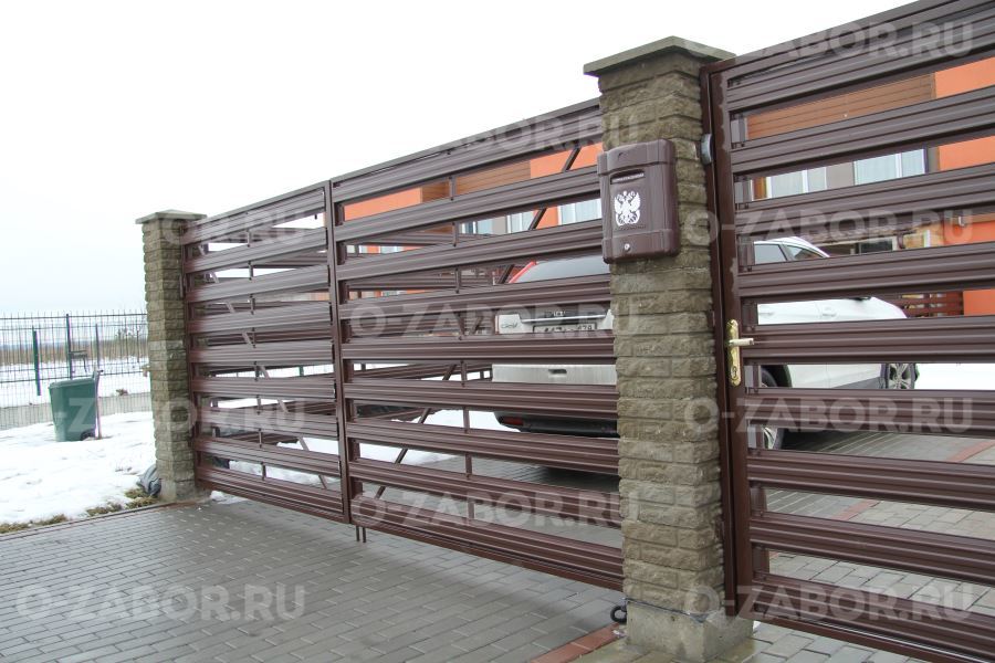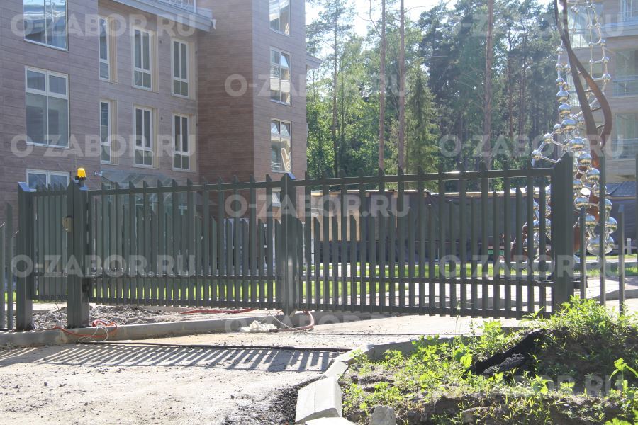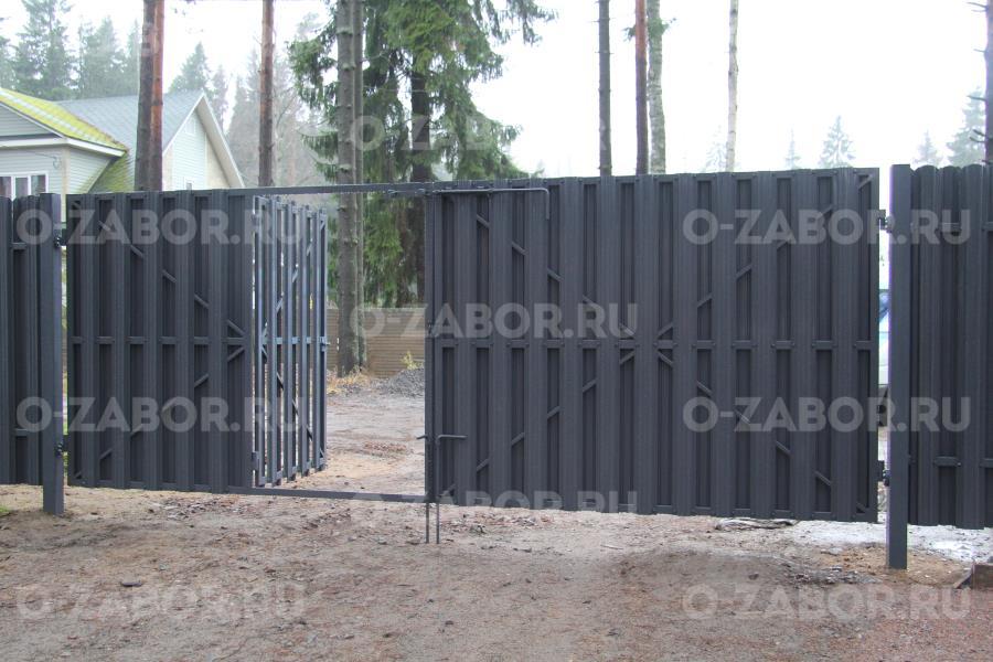 Длина забора 1200 метров, шесть въездов от 5-ти до- 7ми метров, пять распашных ворот и одни откатные ворота.