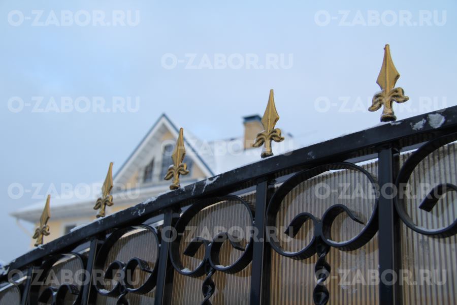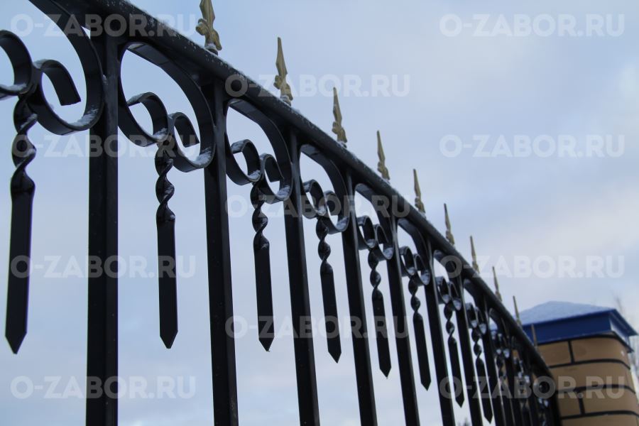 Длина фасада 95 метров. Арочные секции с "позолоченными" пиками из профильной трубы 20х20 и декоративными вставками. Двое откатных ворот в каркасе "Бизнес".