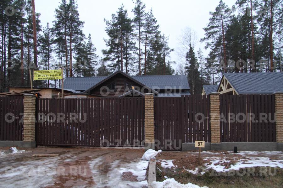Длина забора 152 метра. Штакетник шириной 132 мм, высотой 2 метра, покрытие полимерное RAL8017, столбы столбы - колотый кирпич 360х360 мм, откатные ворота и калитка серии "Бизнес".