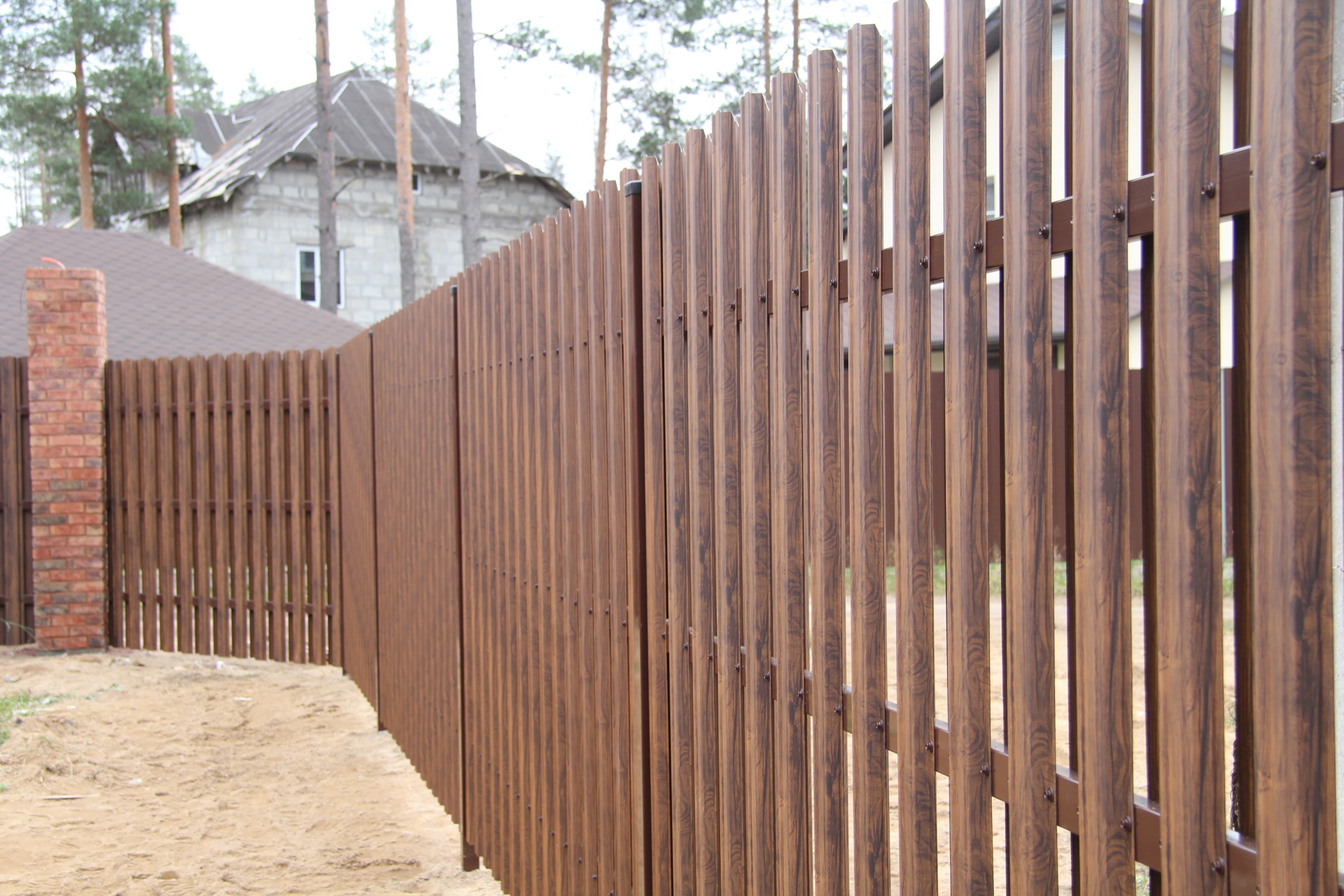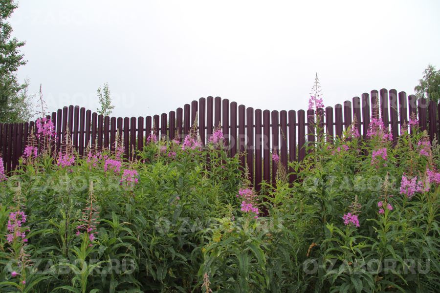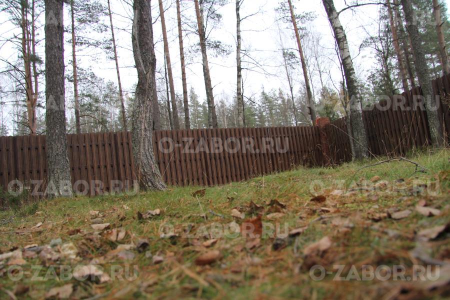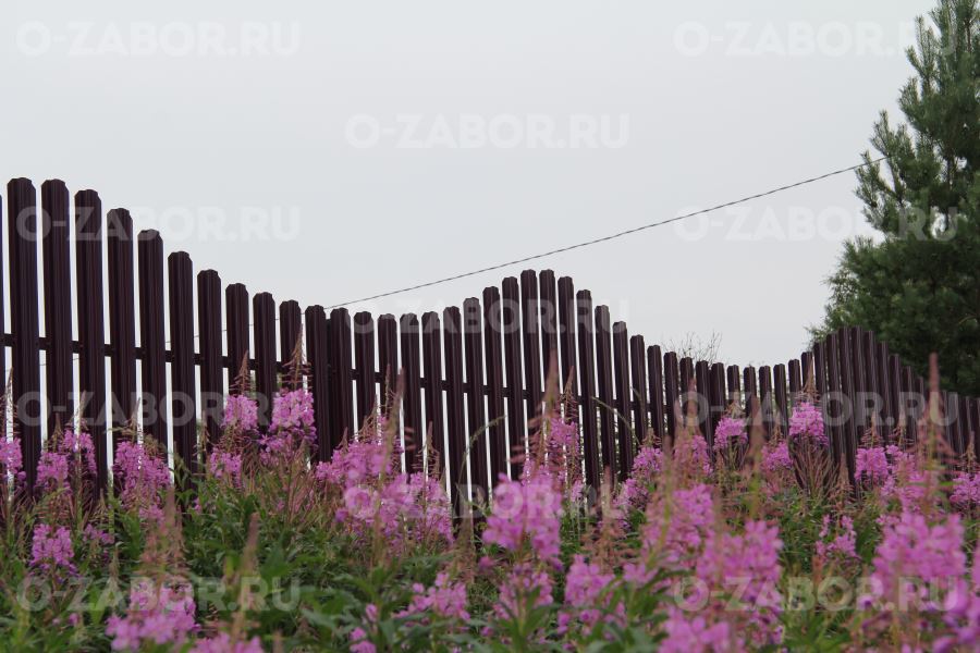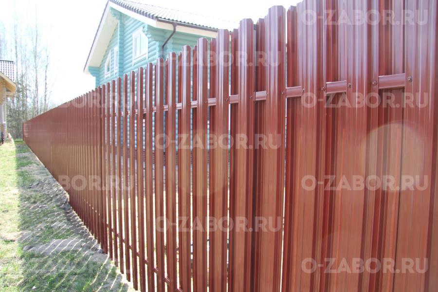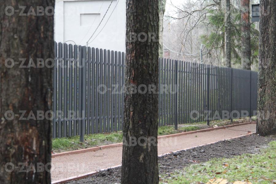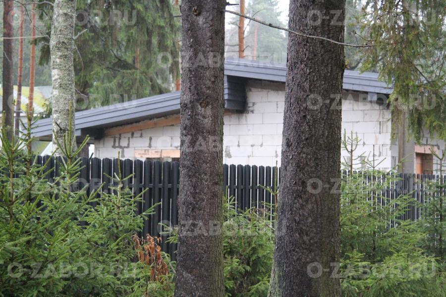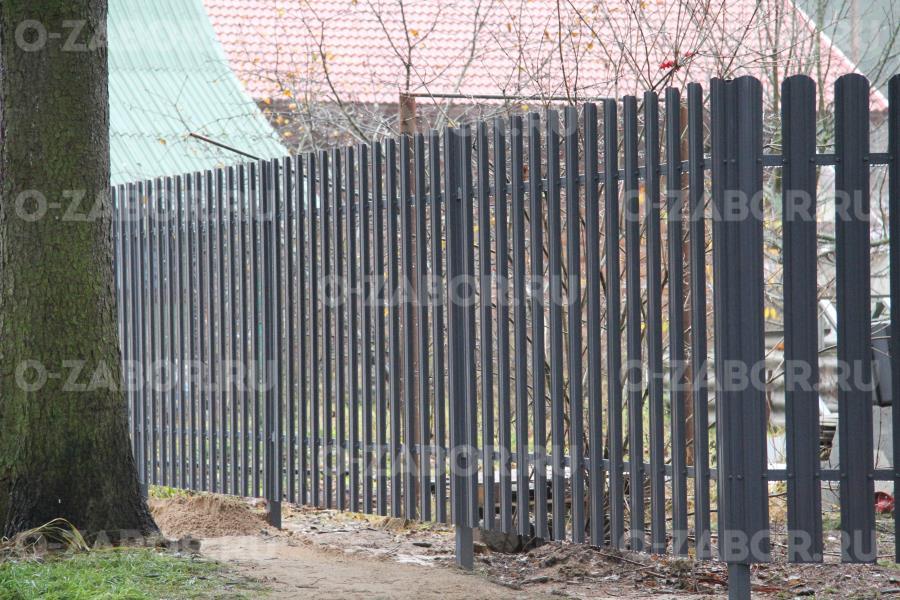 Длина забора 110 метра. Штакетник шириной 120 мм, высотой 1,8 метра, покрытие полимерное RAL8017.