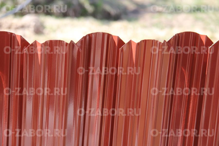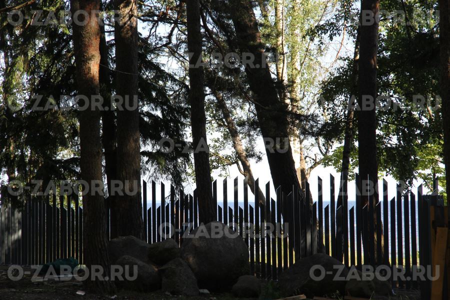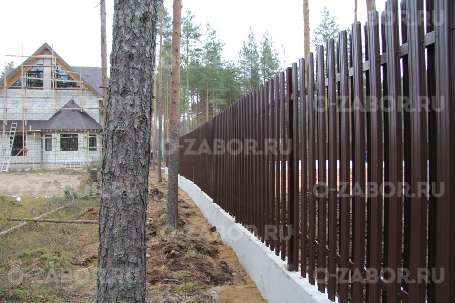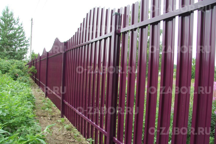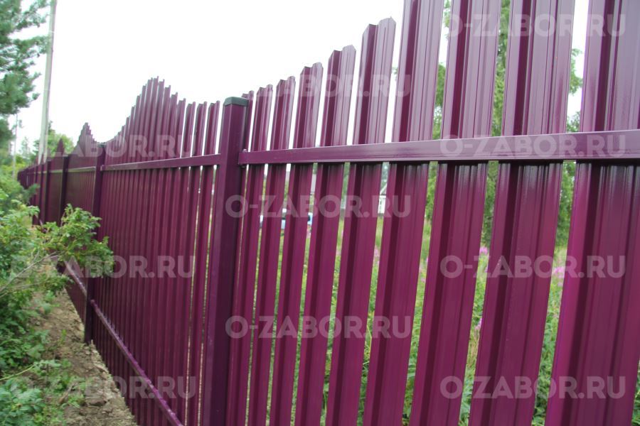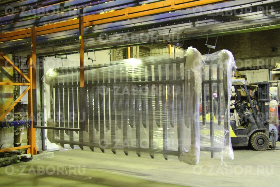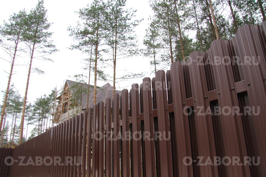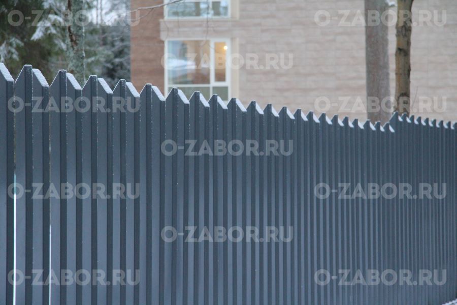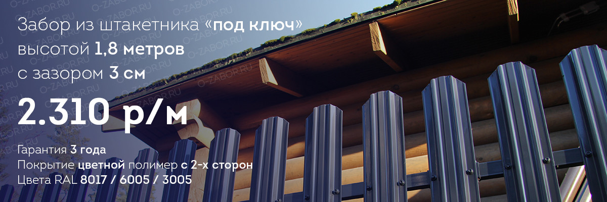 Длина забора 110 метра. Штакетник шириной 120 мм, высотой 1,8 метра, покрытие полимерное RAL8017.