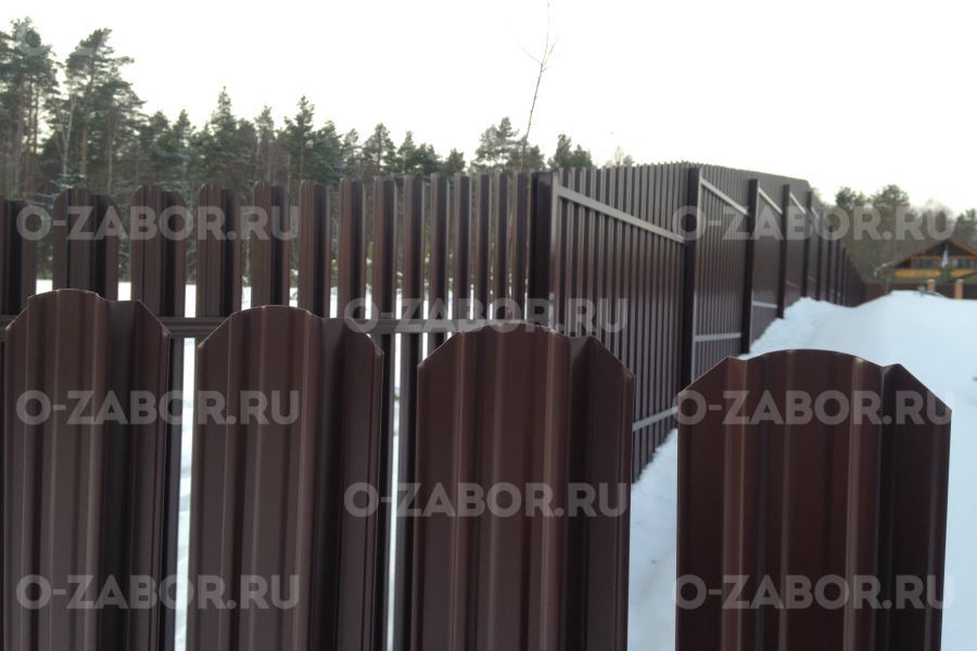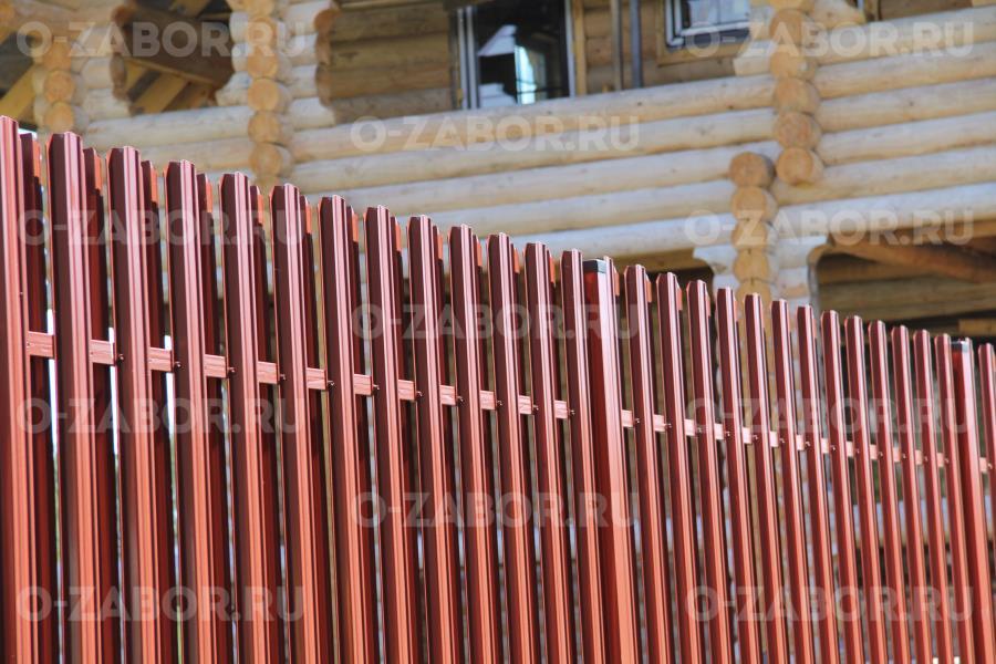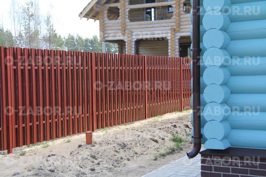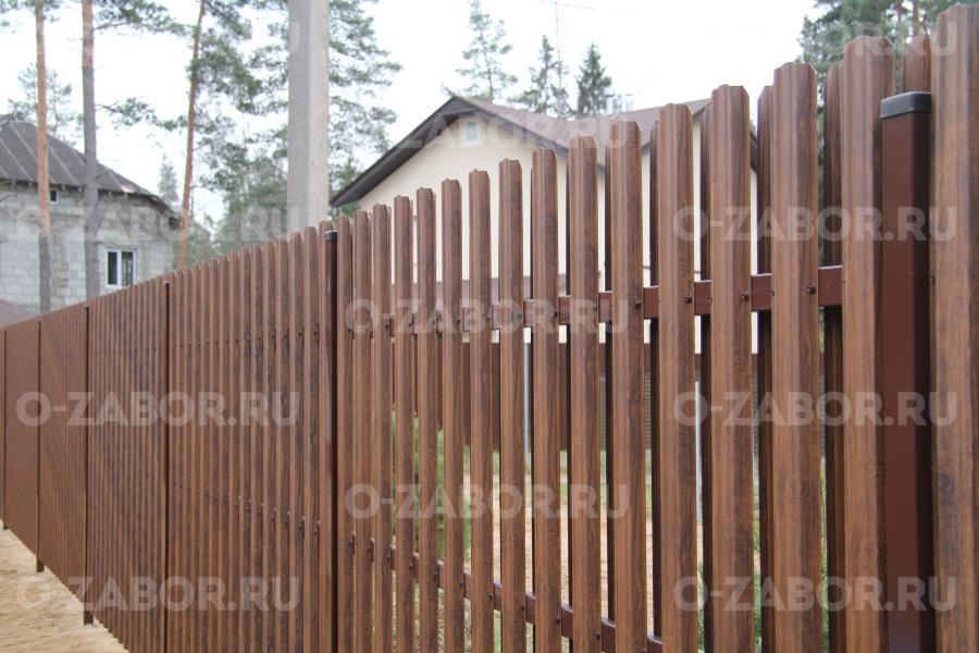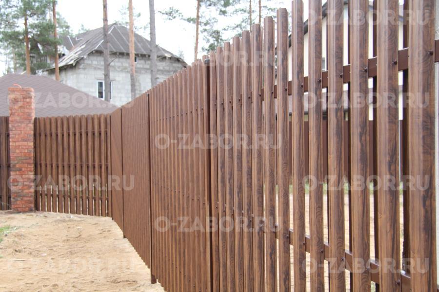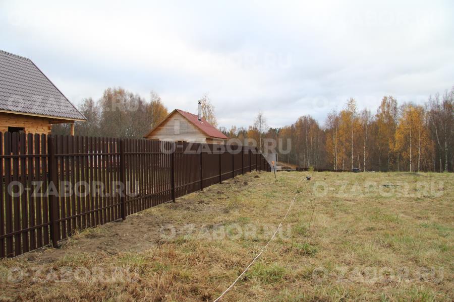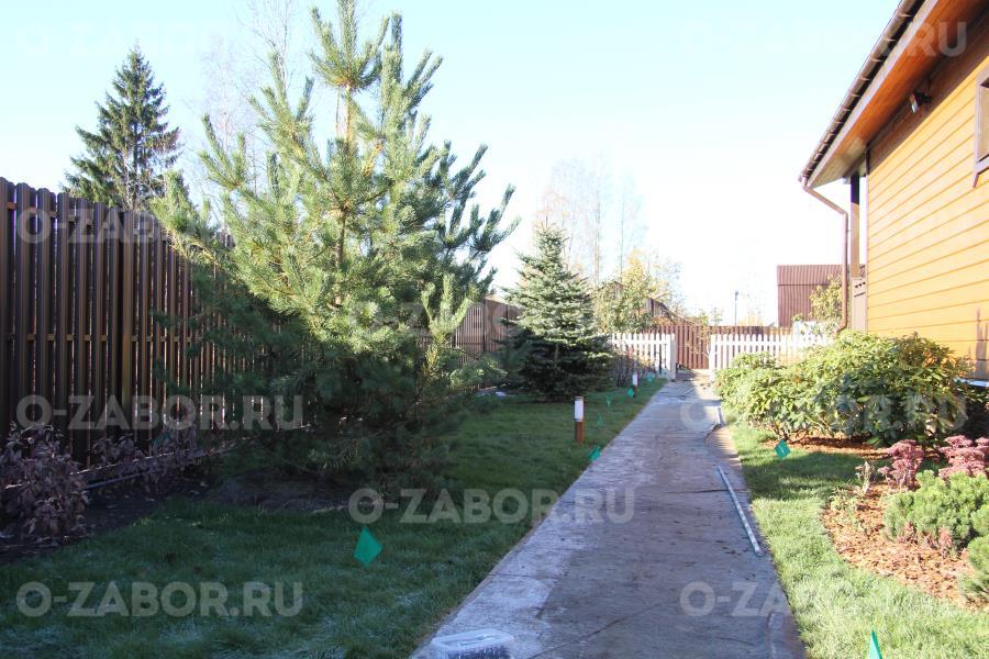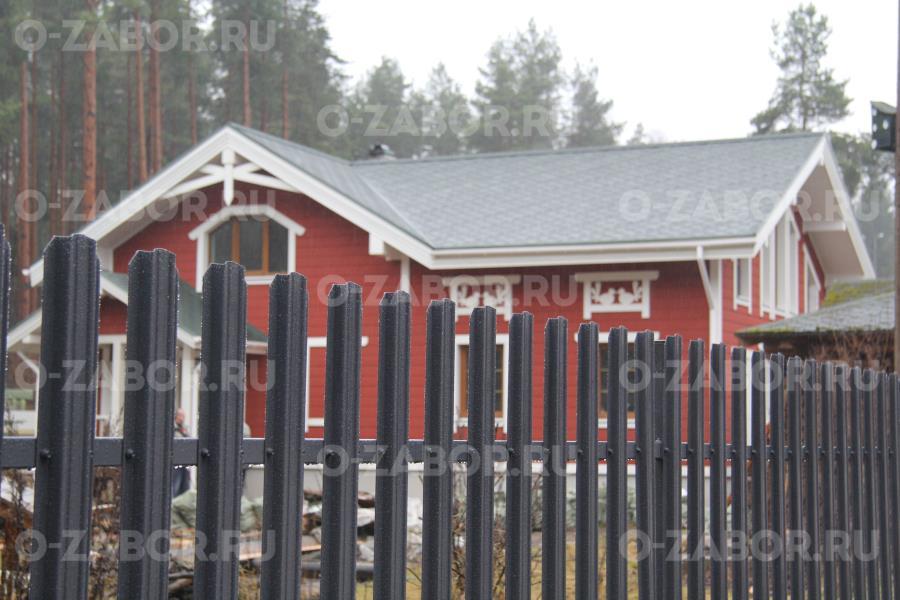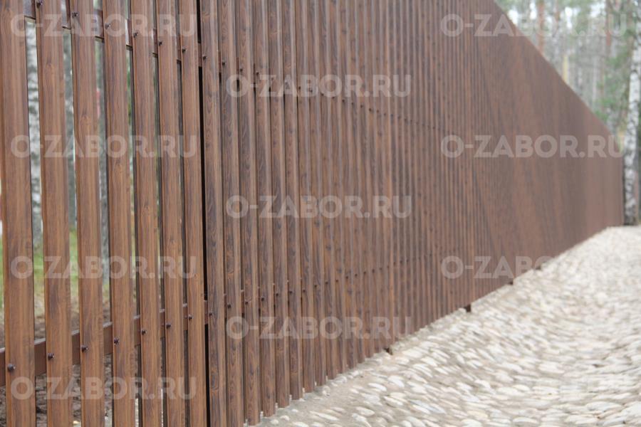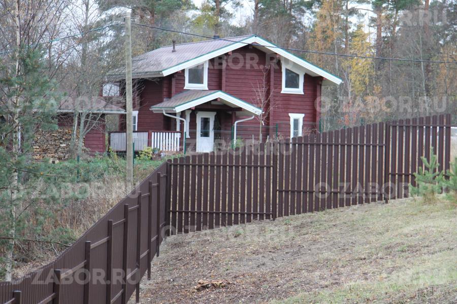 Длина забора 65 метров. Штакетник шириной 136 мм, длиной по 3 метра, покрытие полимерное RAL8017.