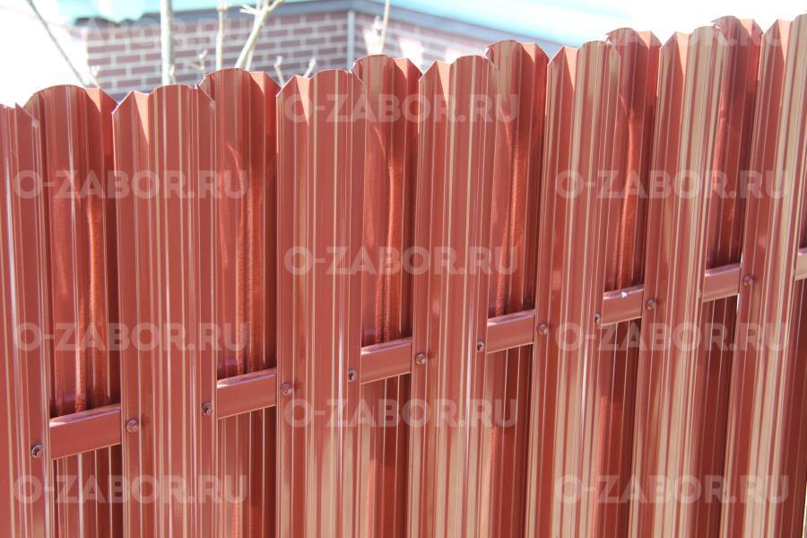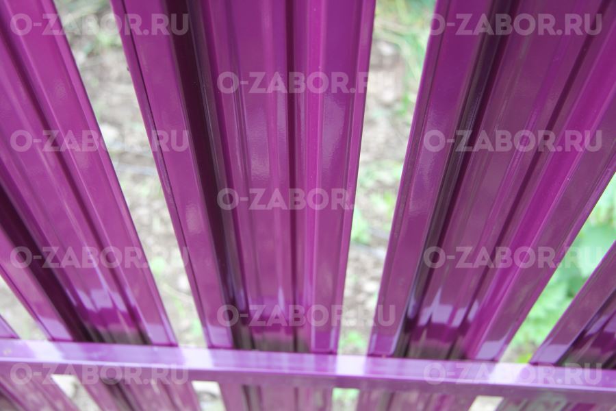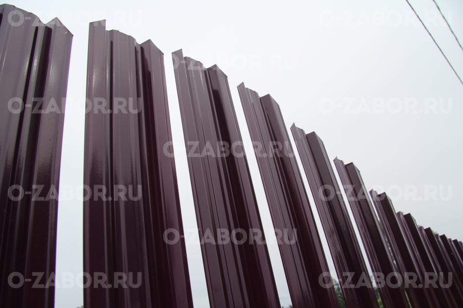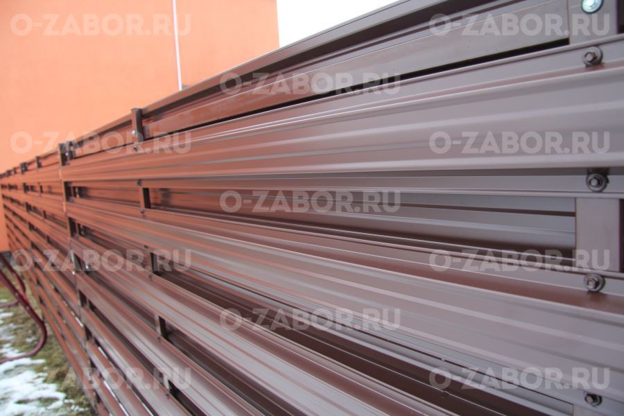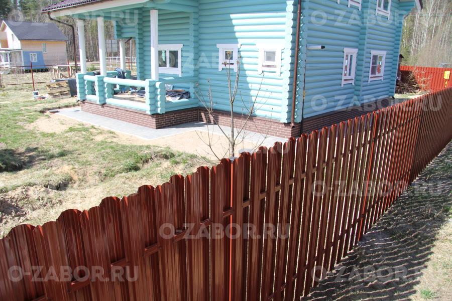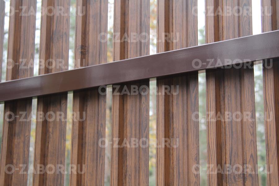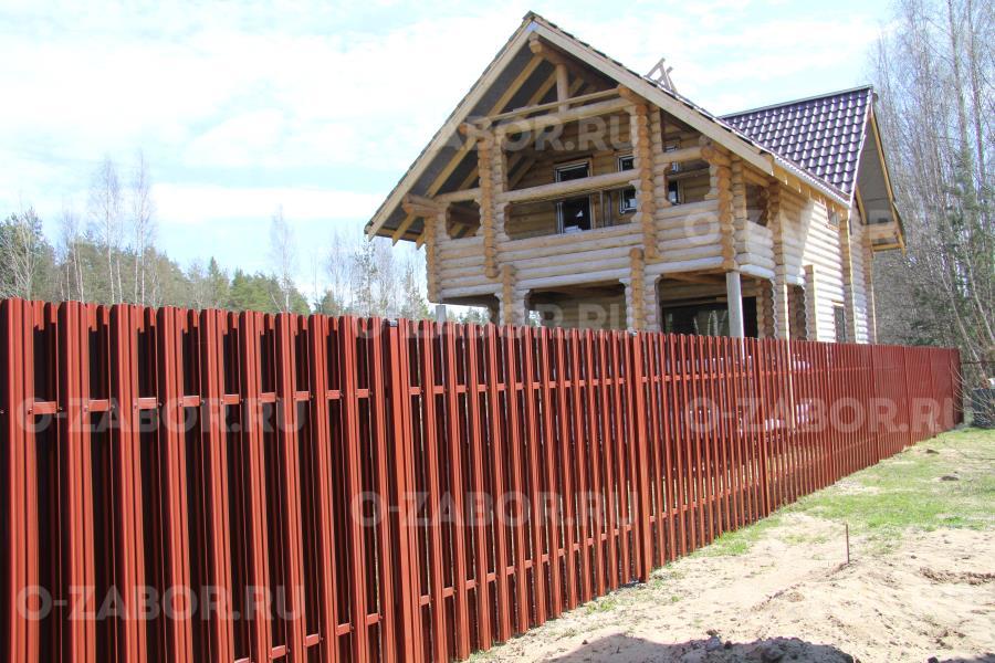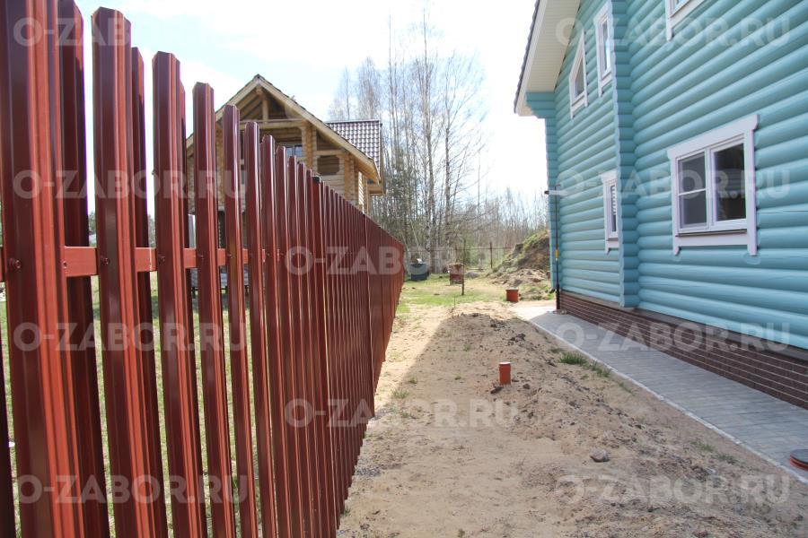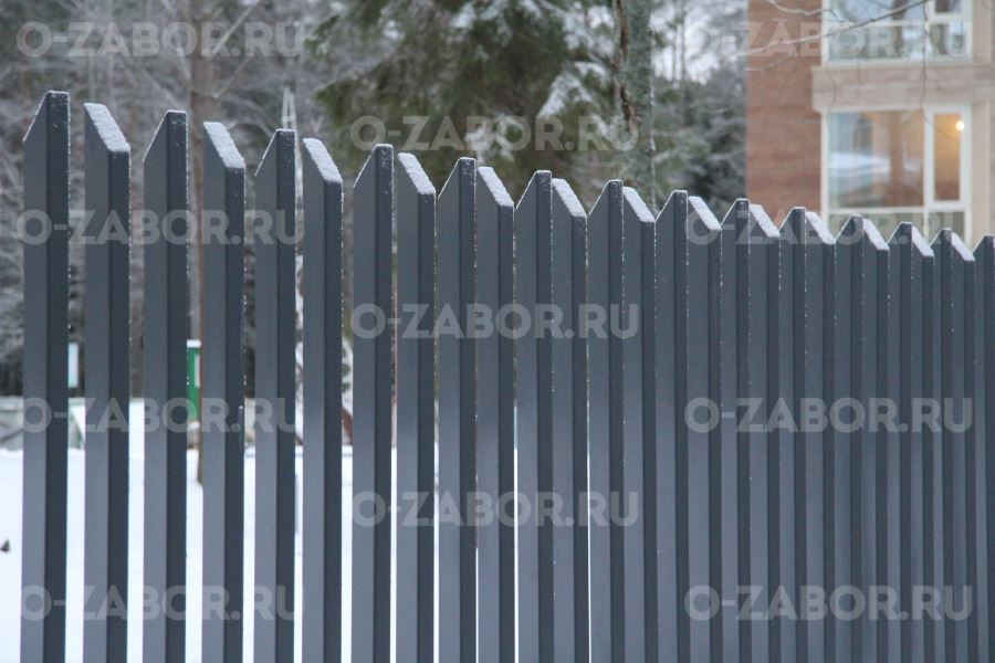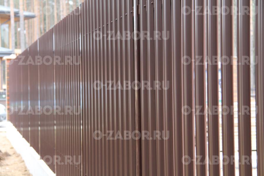 Длина забора 65 метров. Штакетник шириной 136 мм, длиной по 3 метра, покрытие полимерное RAL8017.