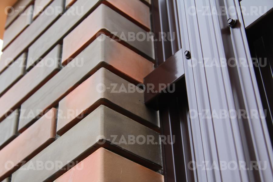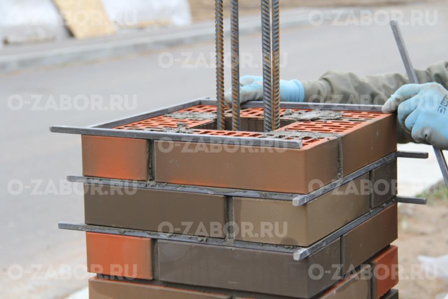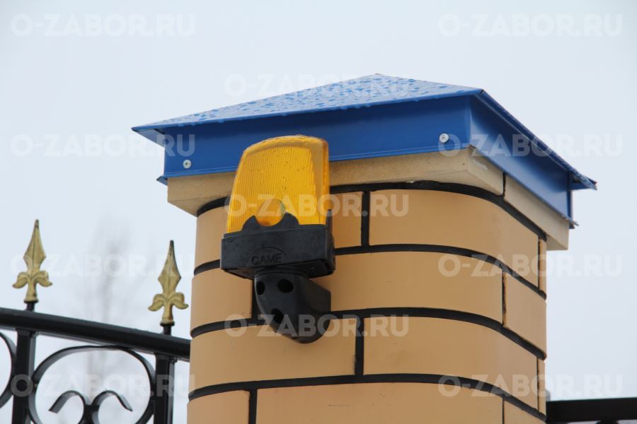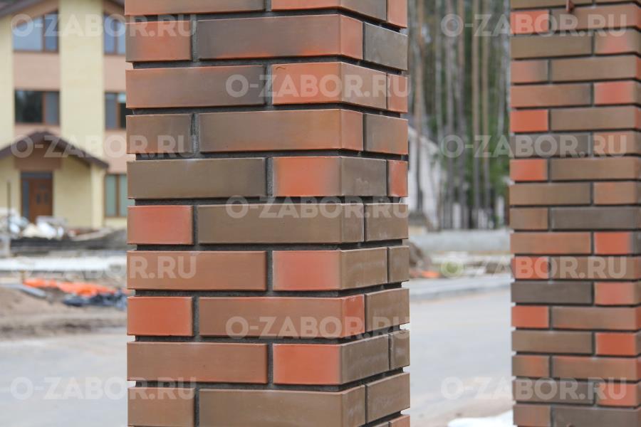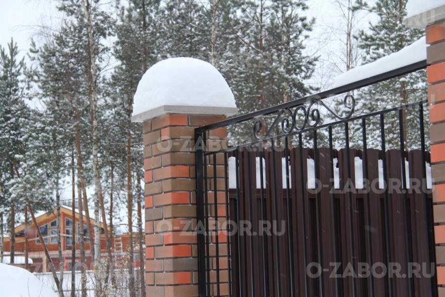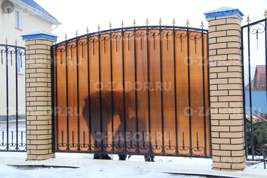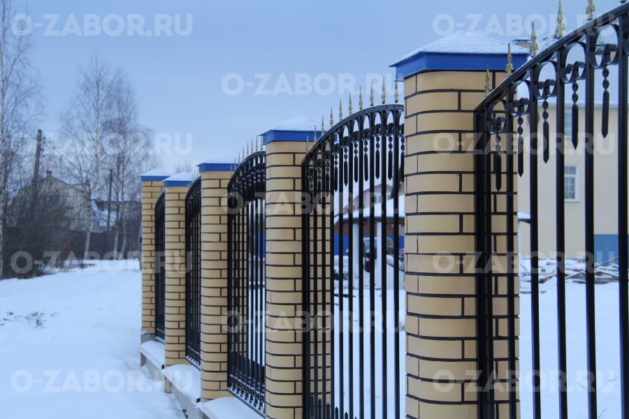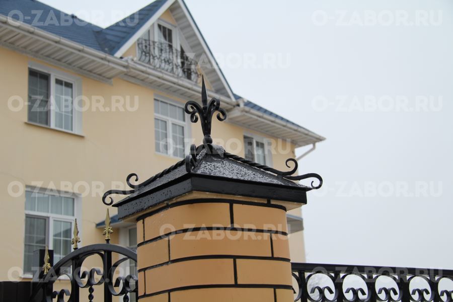 Кирпичные столбы янтарного цвета, ковка в черном порошковом покрытии. По всей длине лента.