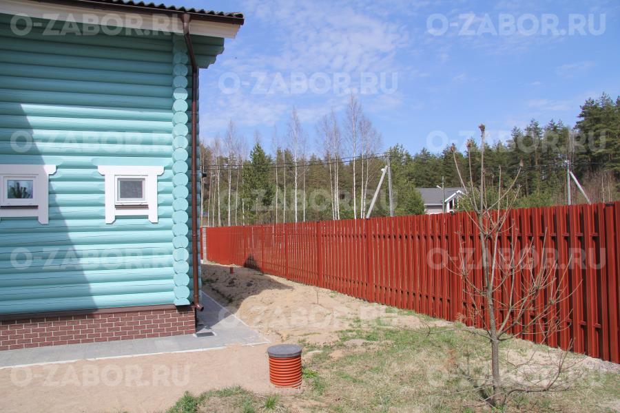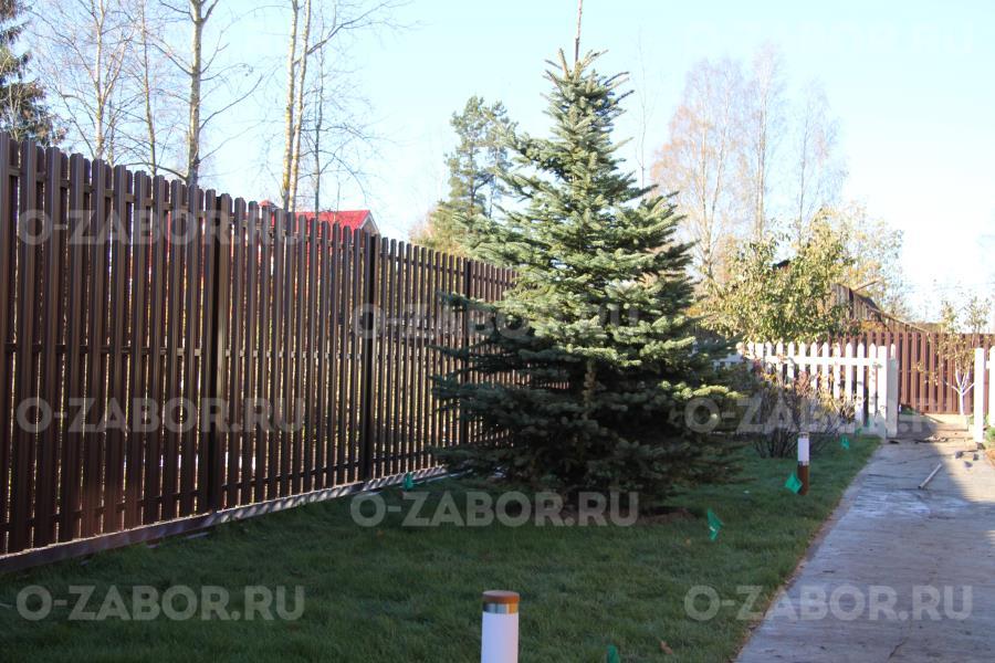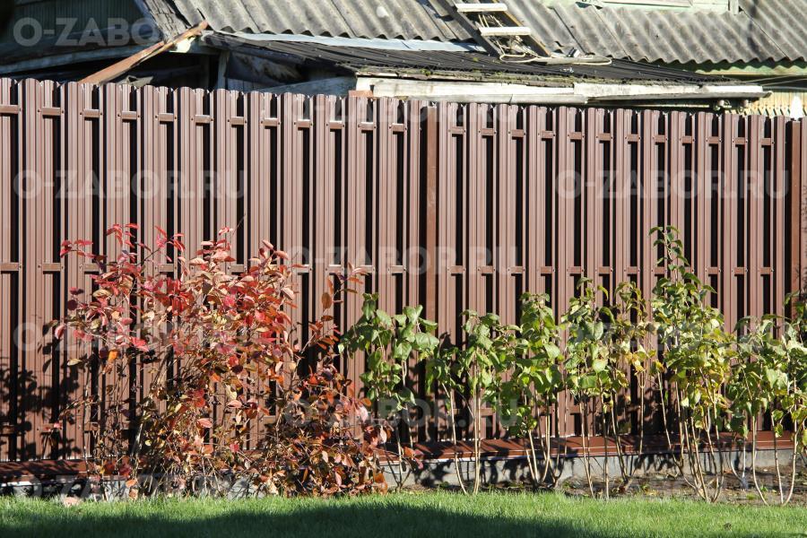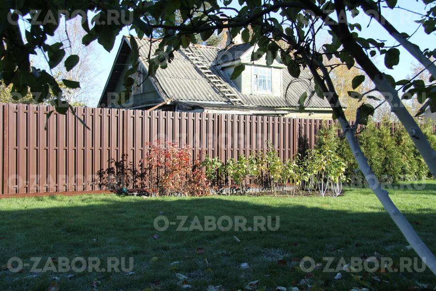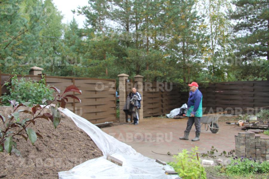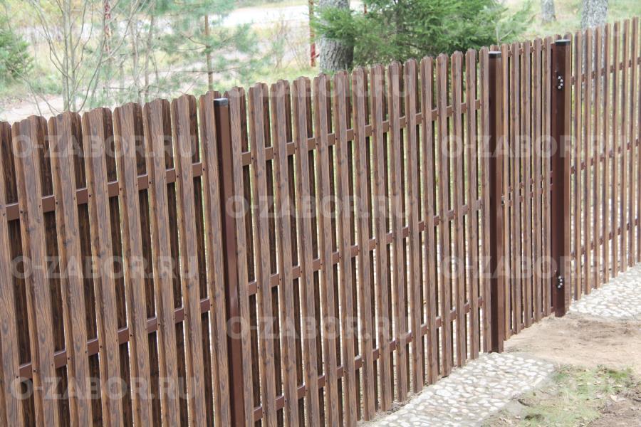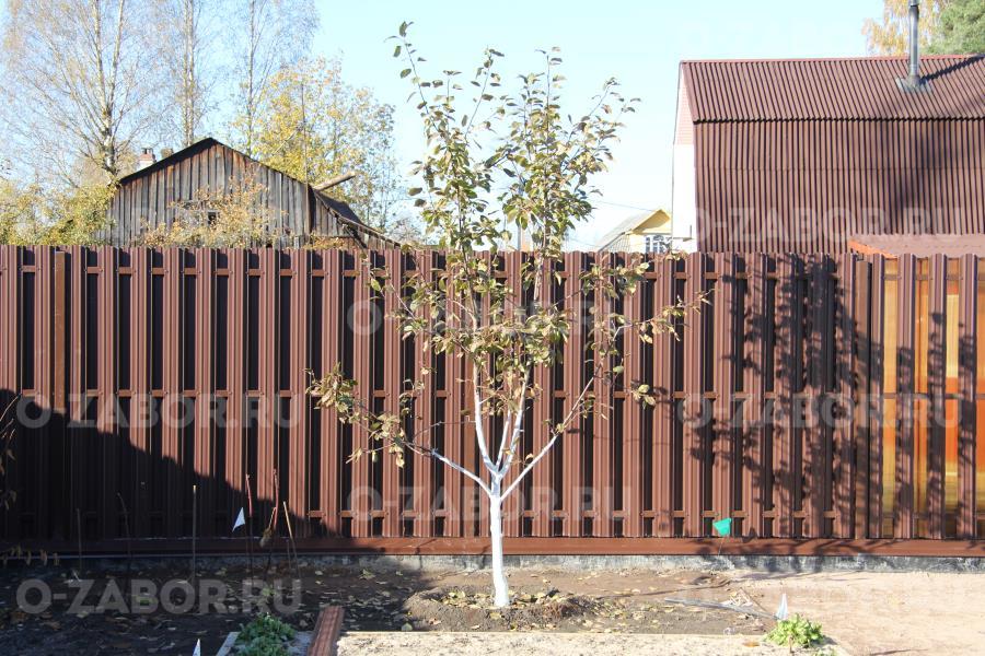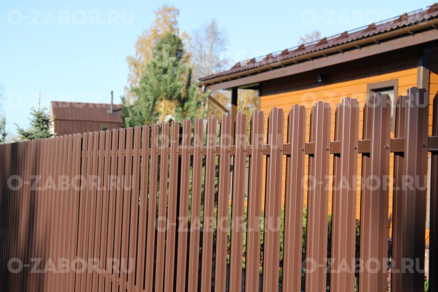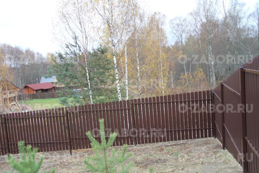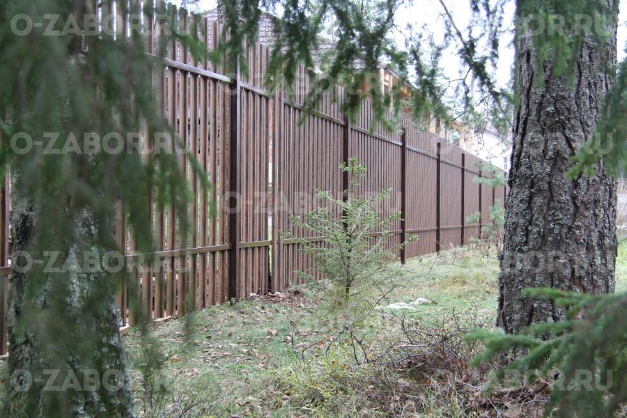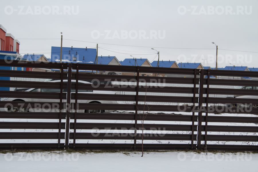 Длина периметра ограждения 170 метров. Штакетник шириной 120 мм, цвет RAL8017 в полимерном покрытии, зашивка с одной стороны с зазором 3 см.