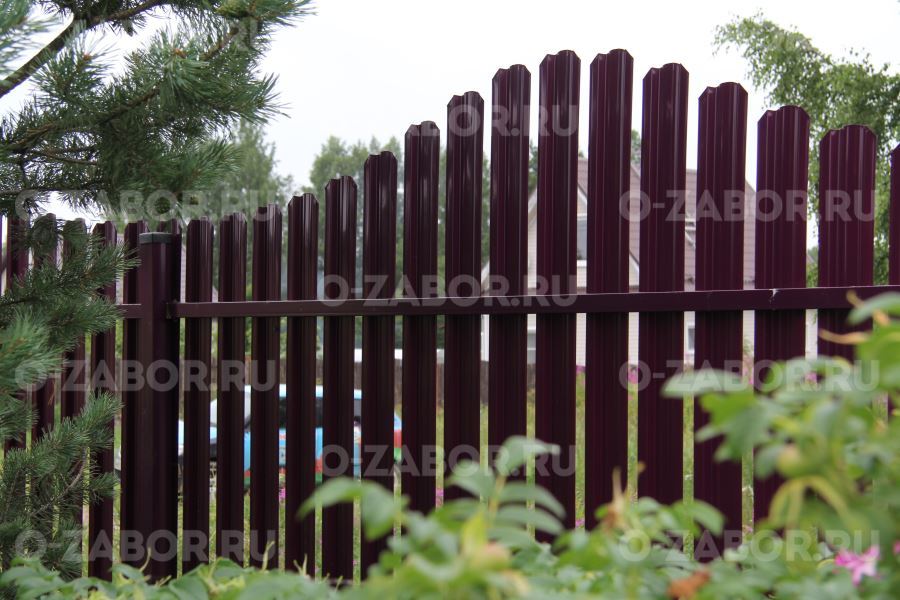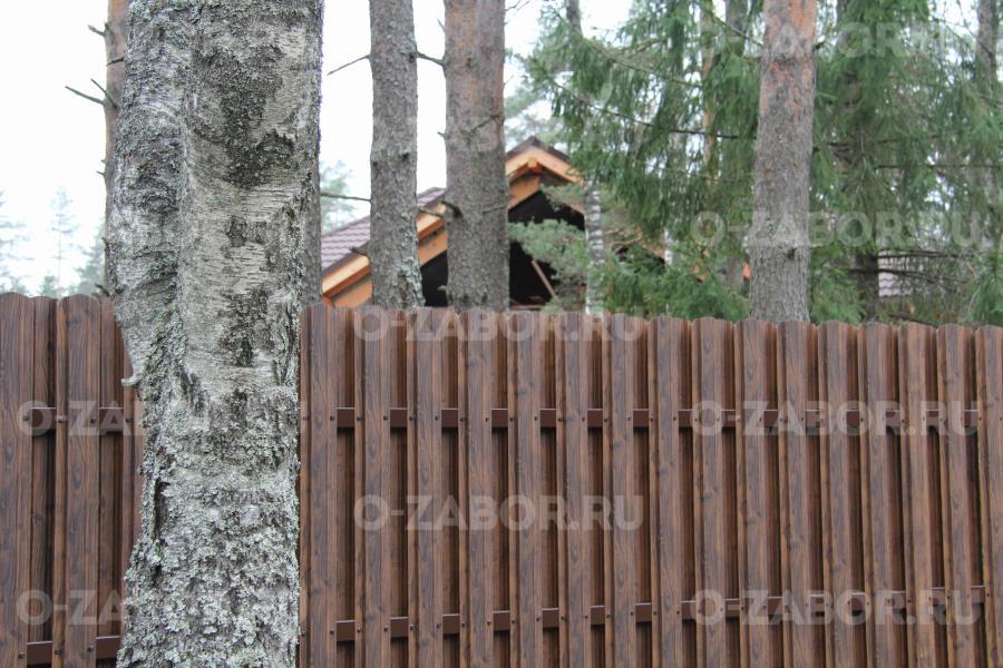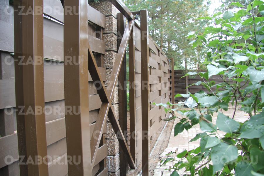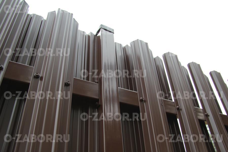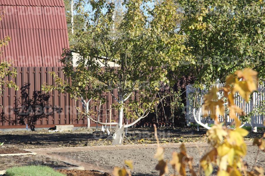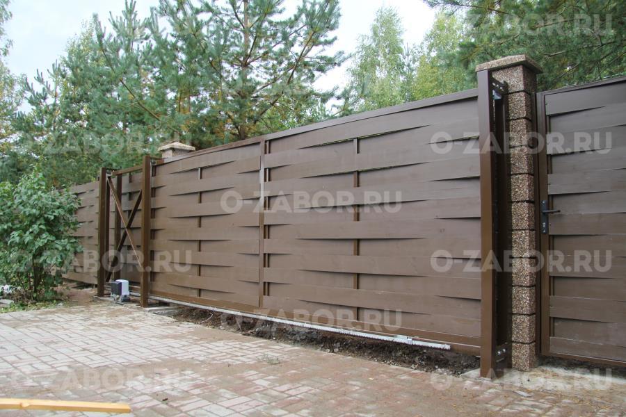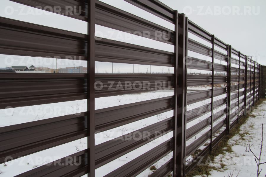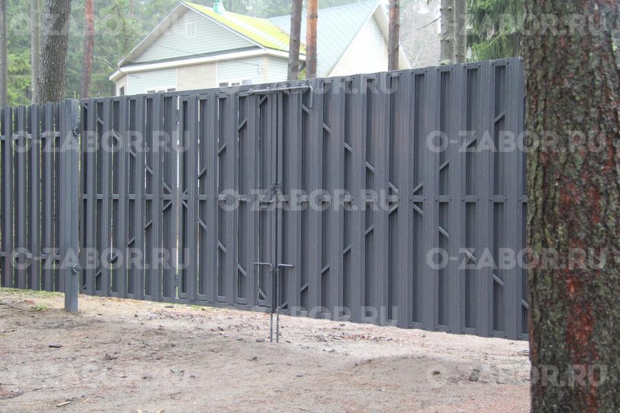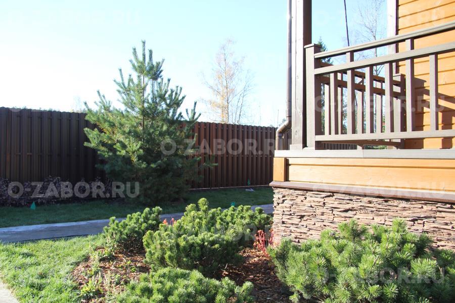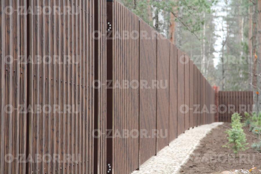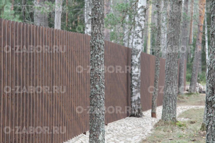 Длина периметра ограждения 170 метров. Штакетник шириной 120 мм, цвет RAL8017 в полимерном покрытии, зашивка с одной стороны с зазором 3 см.