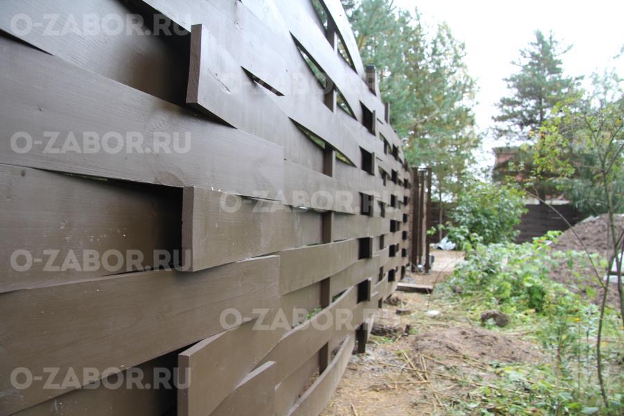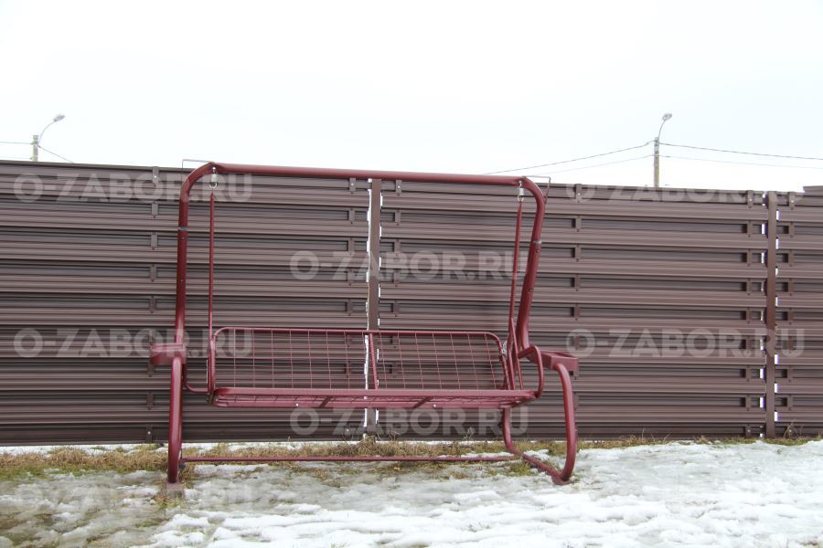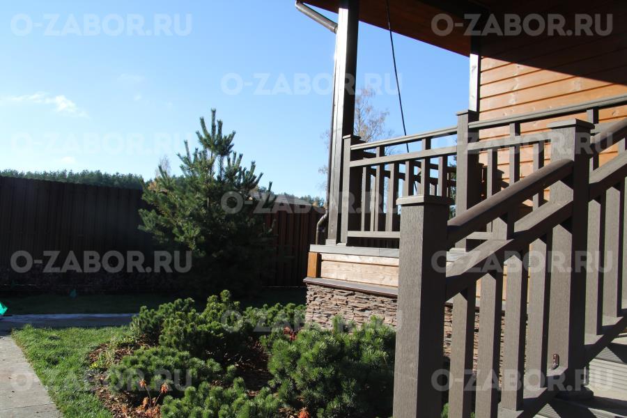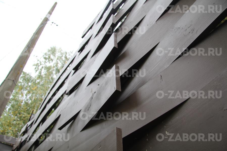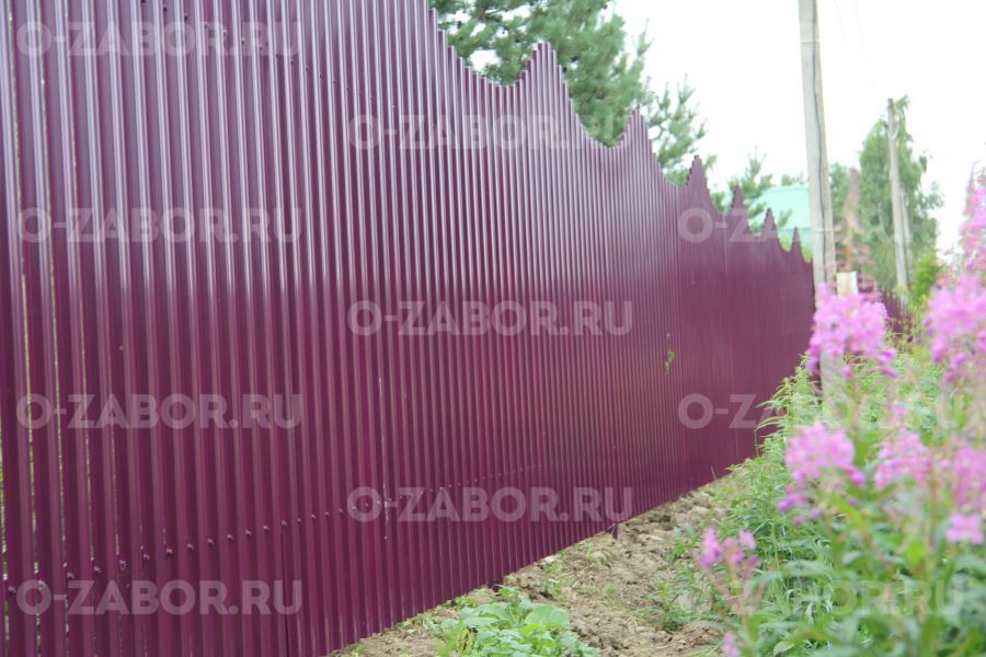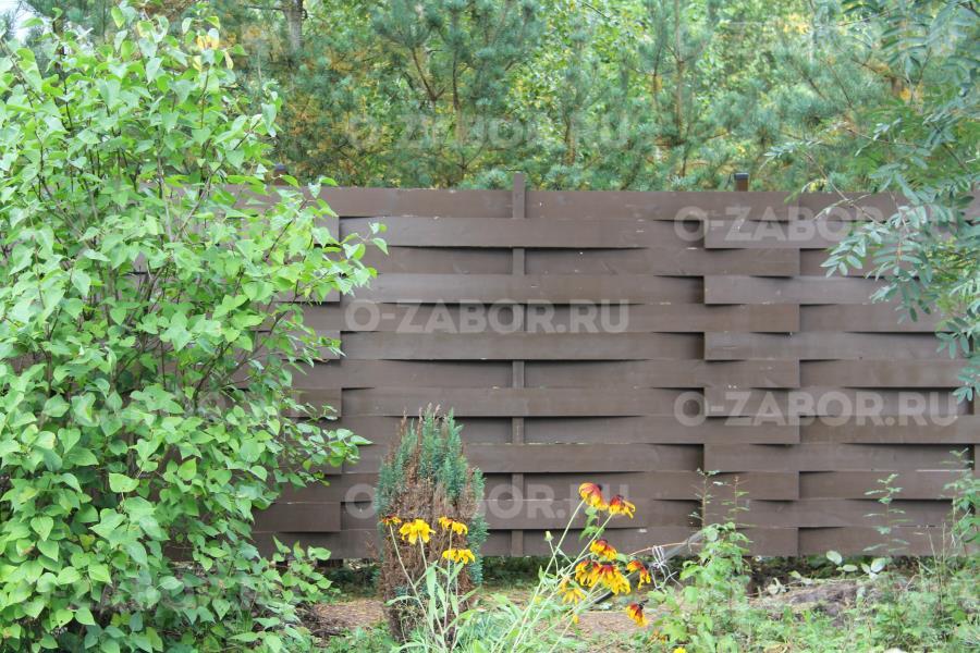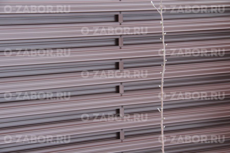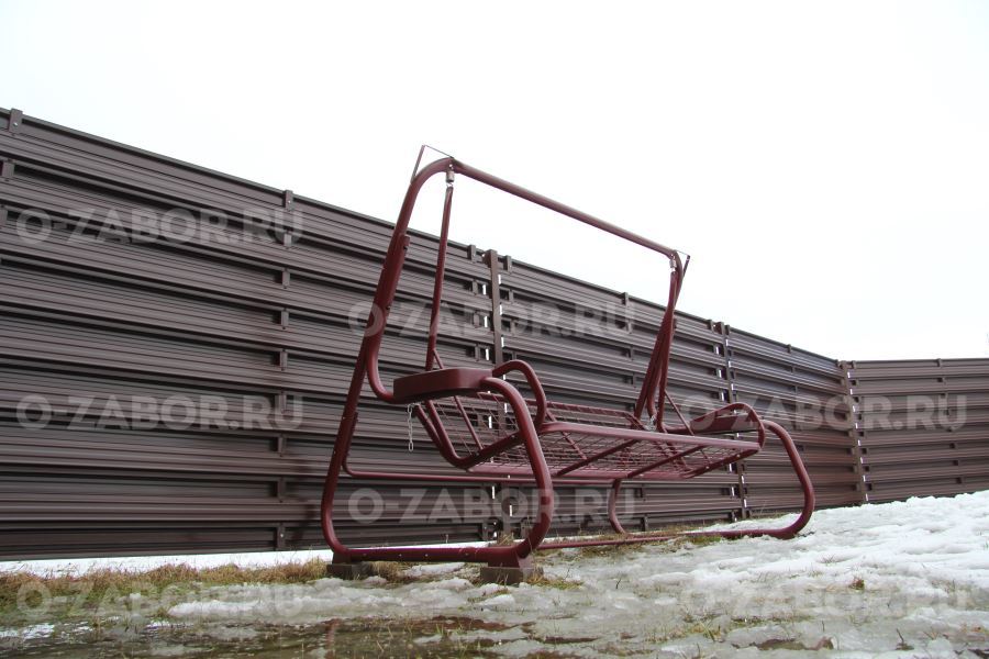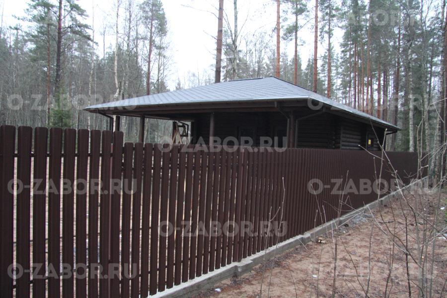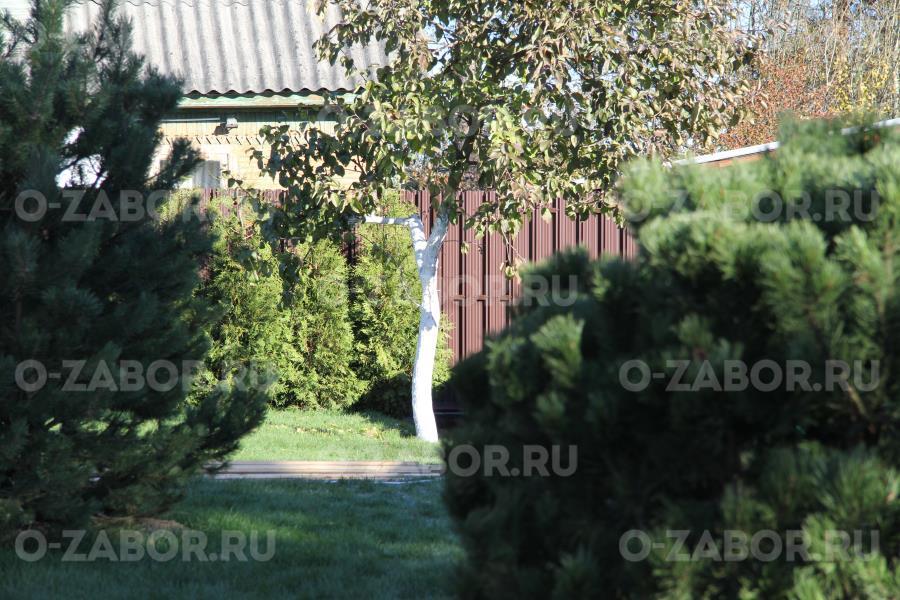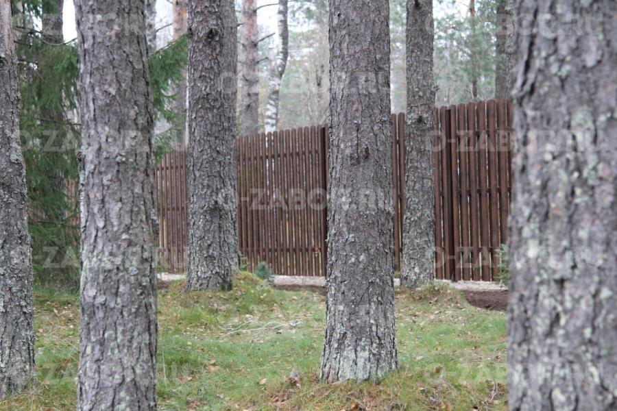 Длина периметра ограждения 170 метров. Штакетник шириной 120 мм, цвет RAL8017 в полимерном покрытии, зашивка с одной стороны с зазором 3 см.