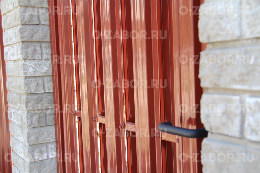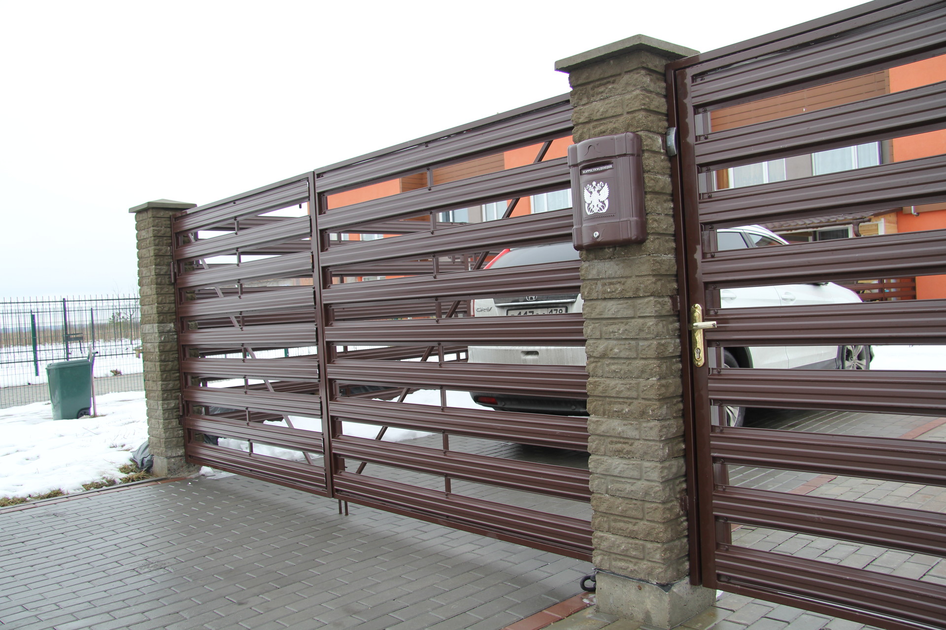 Длина забора 133 метра. Штакетник шириной 120 мм, высотой 2 метра, покрытие порошковое RAL3009, наборные бетонные столбы "колотый кирпич" 310х310 мм, распашные ворота и калитка серии "Бизнес".