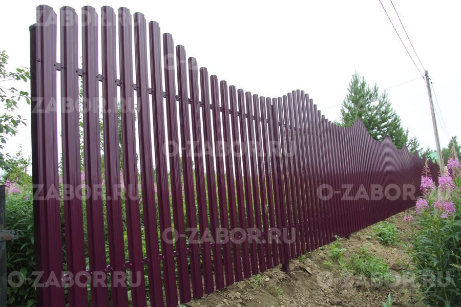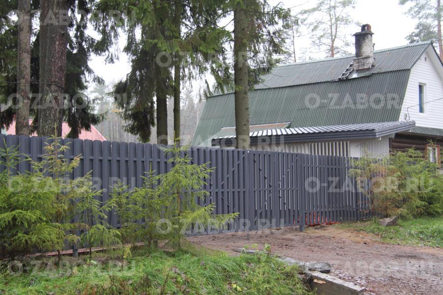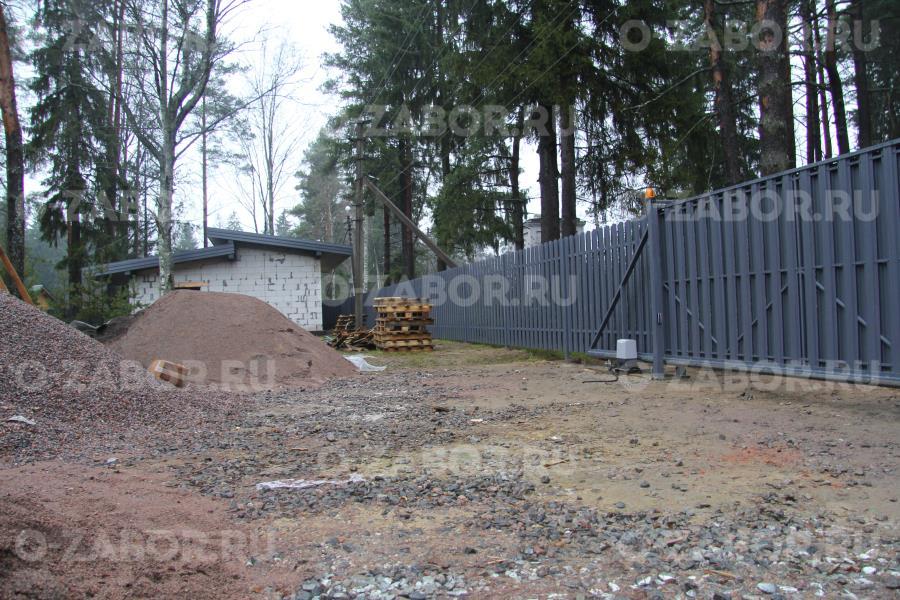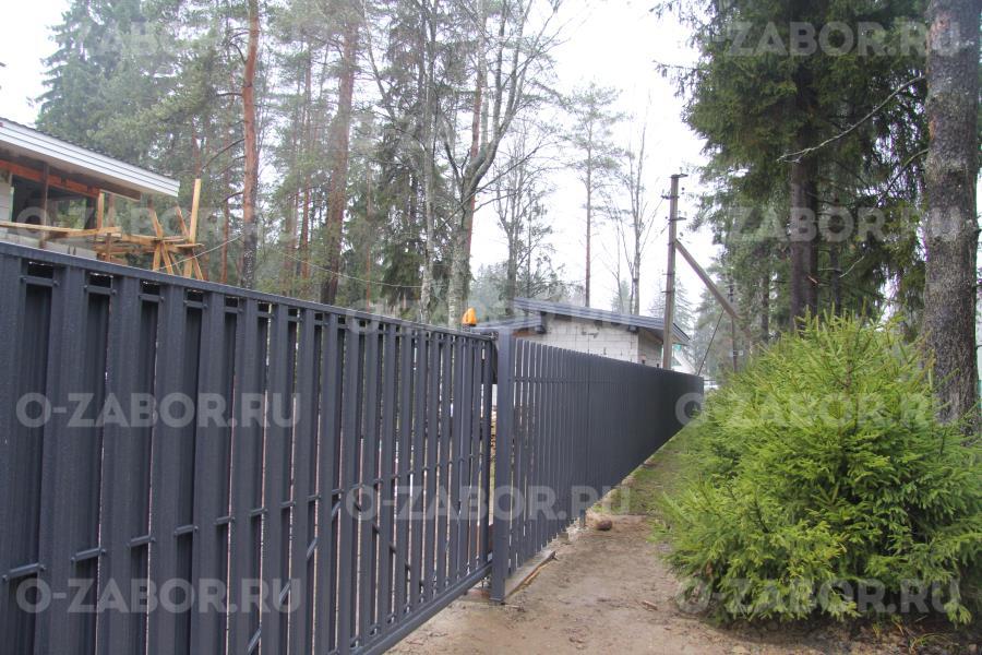 Длина забора 70 метров. Штакетник шириной 120 мм, высотой 1,75 до 2,05 метров, покрытие порошковое RAL4007.