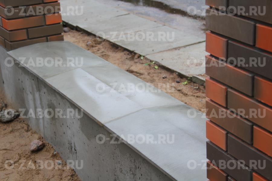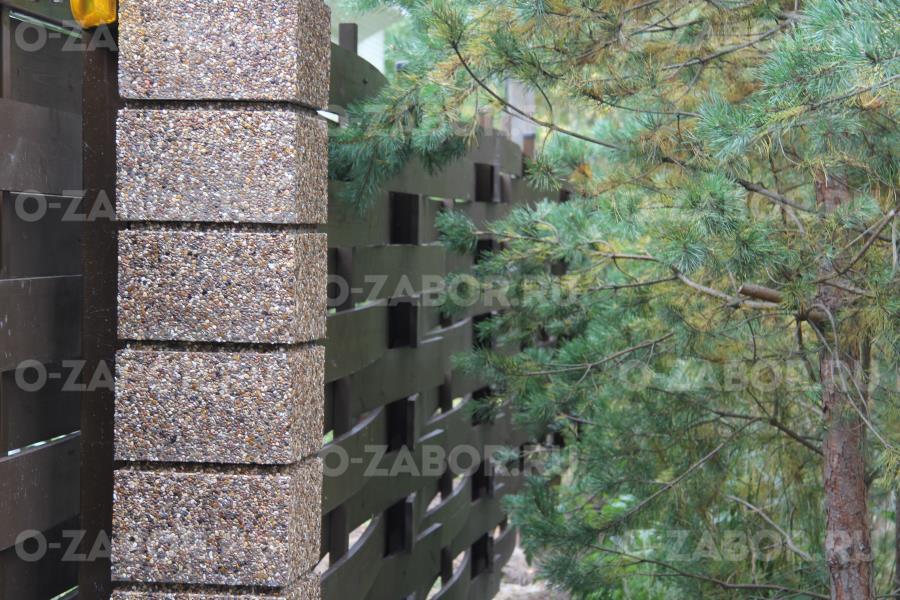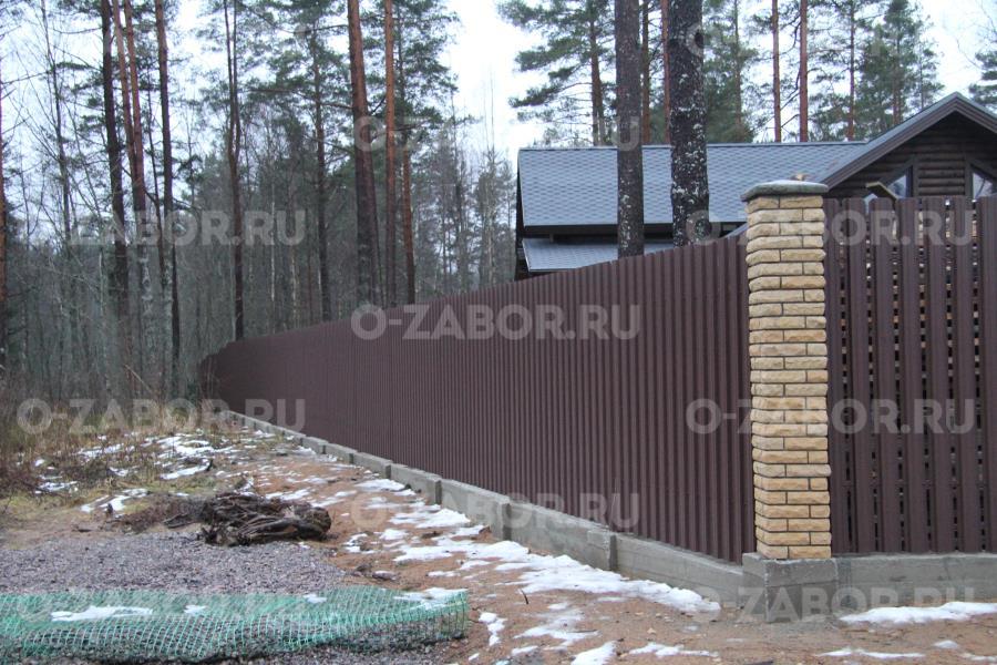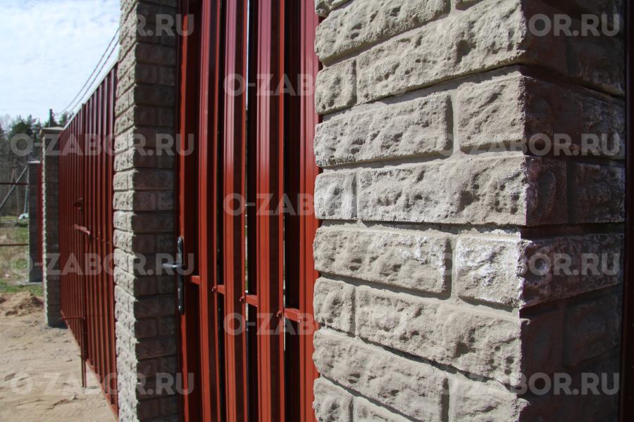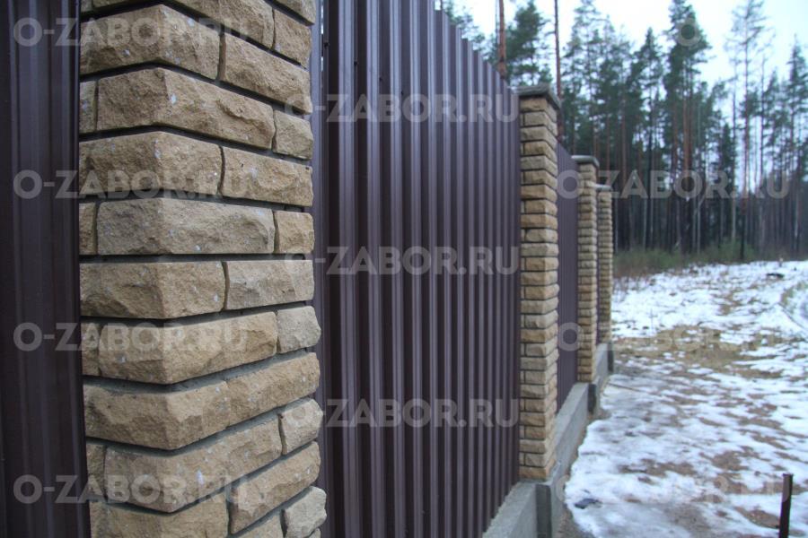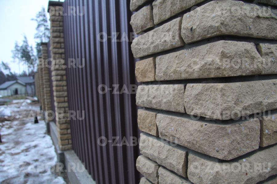 Классический забор на бетонной ленте с колотыми кирпичами.