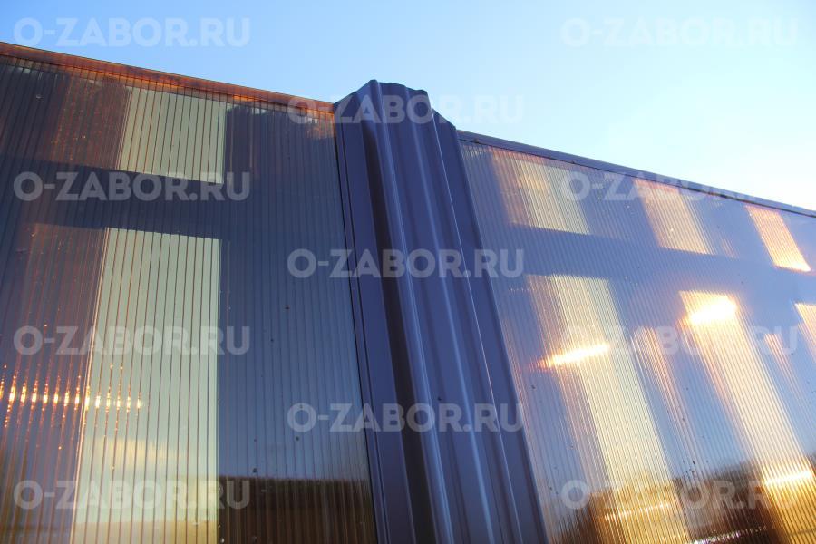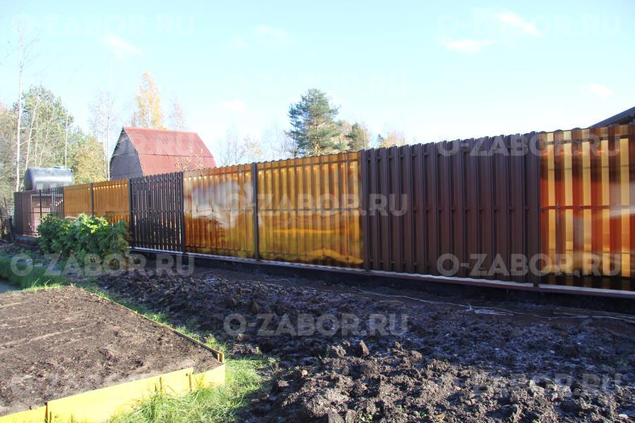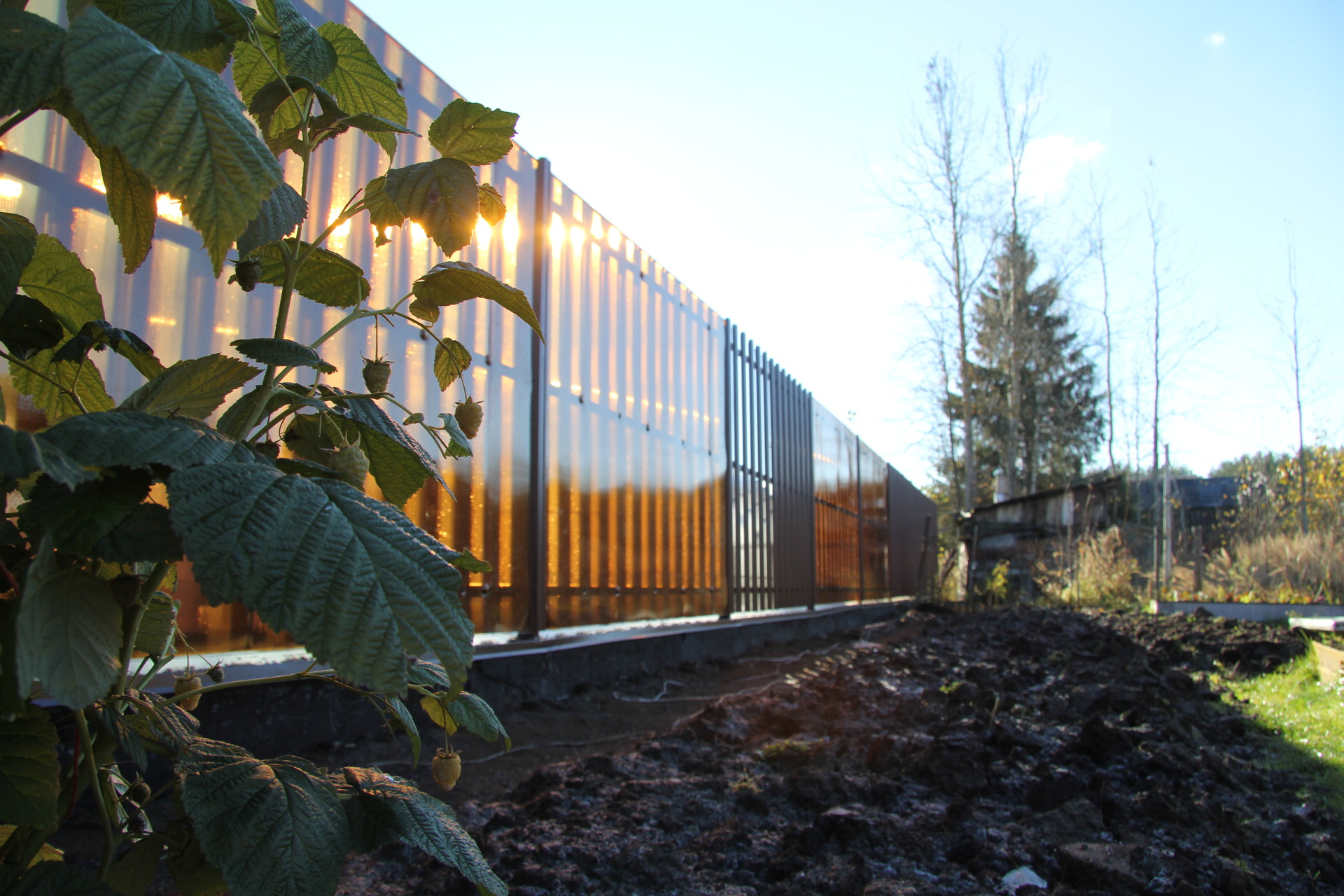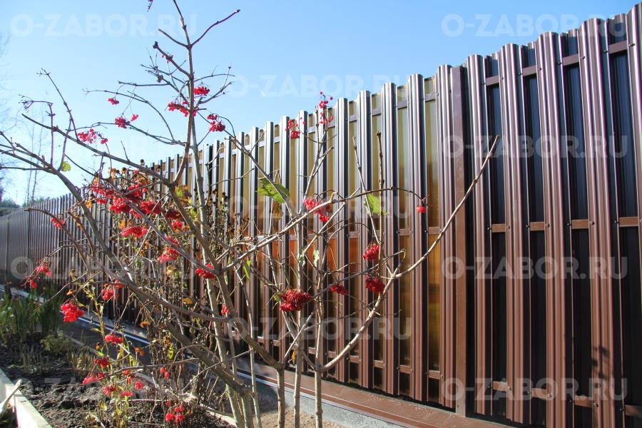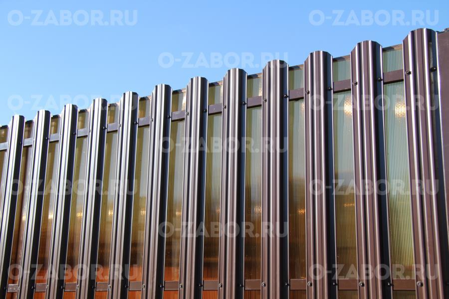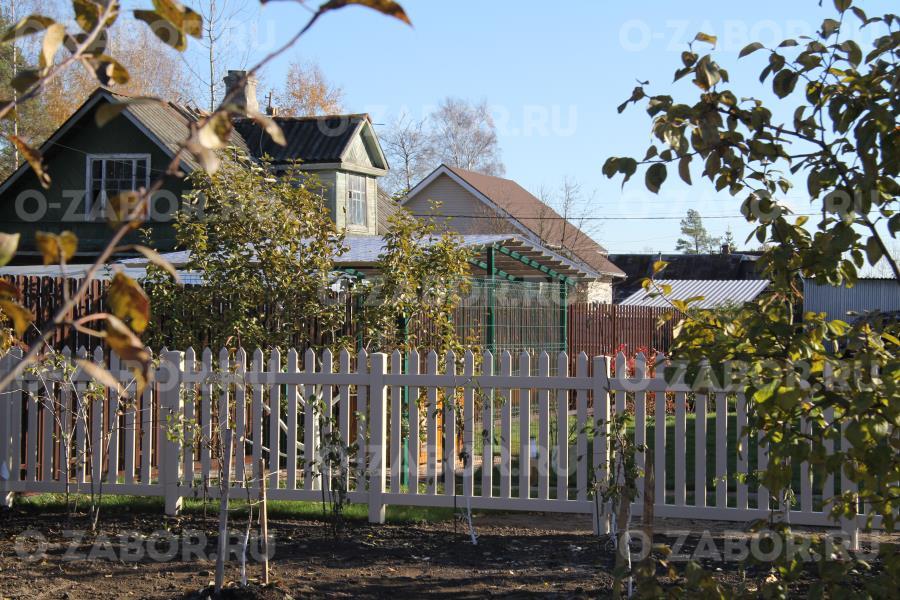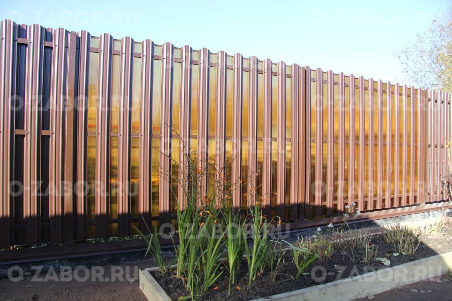 Традиционный забор из штакетника по периметру, с изюминкой из поликарбоната.