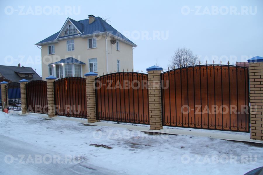 Длина фасада 95 метров. Арочные секции с "позолоченными" пиками из профильной трубы 20х20 и декоративными вставками. Двое откатных ворот в каркасе "Бизнес".