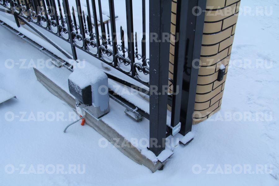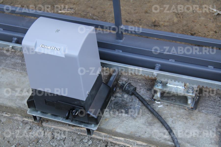 Длина забора 1200 метров, шесть въездов от 5-ти до- 7ми метров, пять распашных ворот и одни откатные ворота.