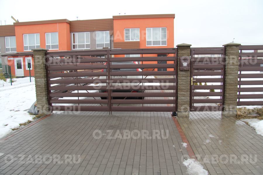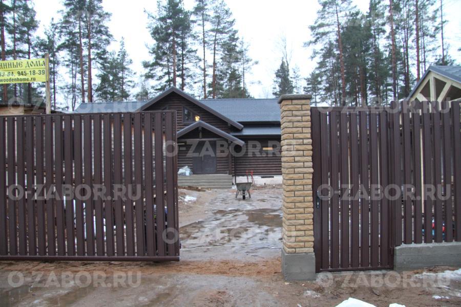 Длина забора 152 метра. Штакетник шириной 132 мм, высотой 2 метра, покрытие полимерное RAL8017, столбы столбы - колотый кирпич 360х360 мм, откатные ворота и калитка серии "Бизнес".