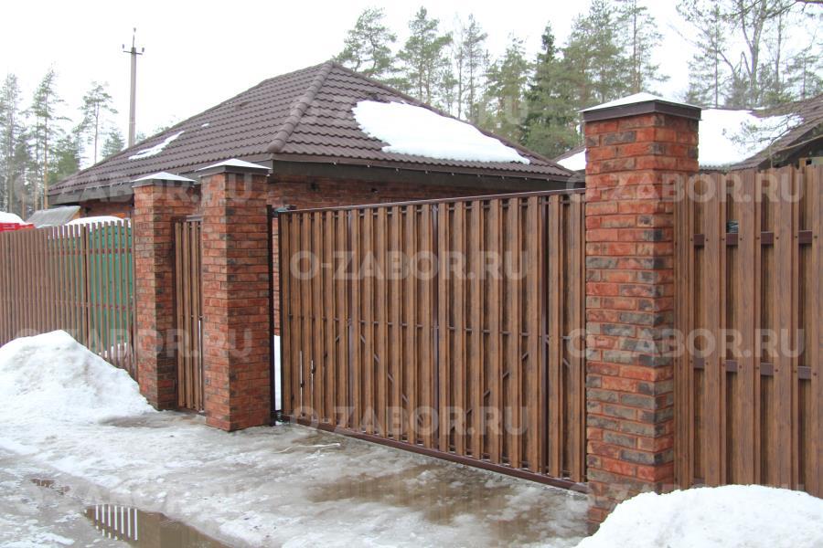 Мы сделали потрясающий забор из благородного штакетника под золотой дуб и кирпича ручной формовки.