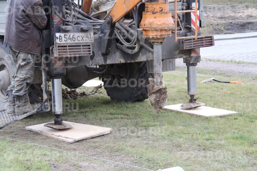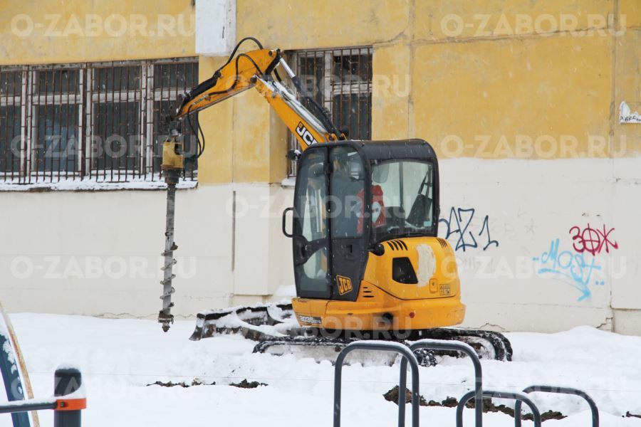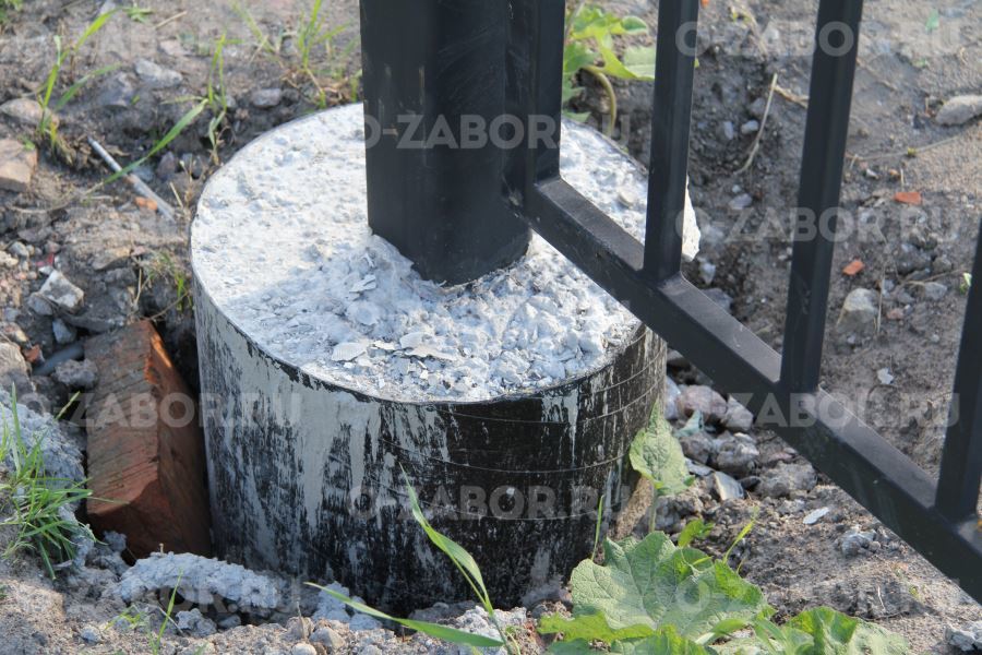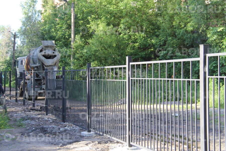 Длина забора 400 метров, двое ворот и калитка. Секции по 3 метра из профильных труб 40х40 и 20х20 мм, огрунтованы и окрашены в черный матовый. Столбы 100х100 мм на прочном двух-составном фундаменте диаметром до 600 мм. Местами глубина фундамента составляет 2,2 метра.