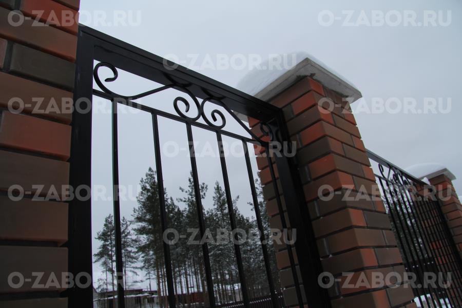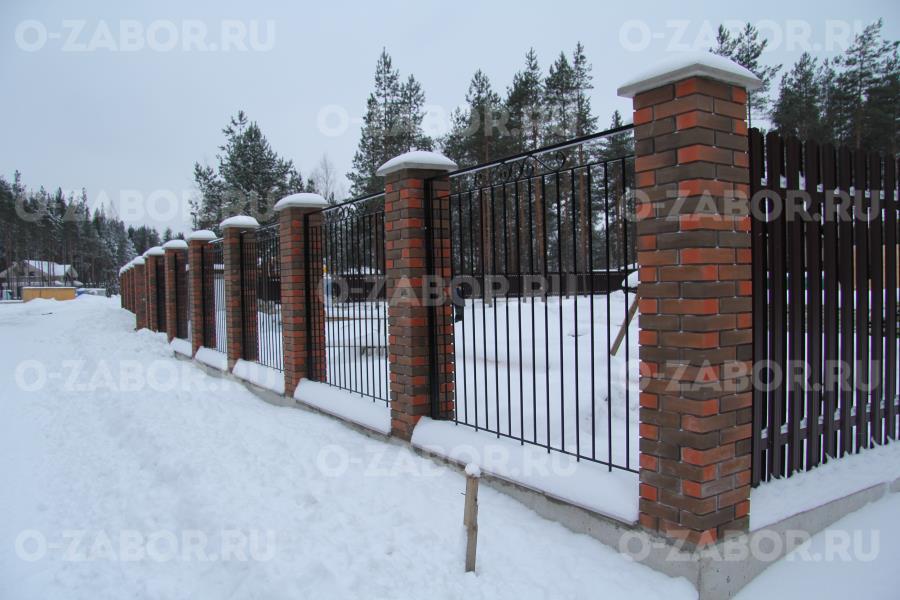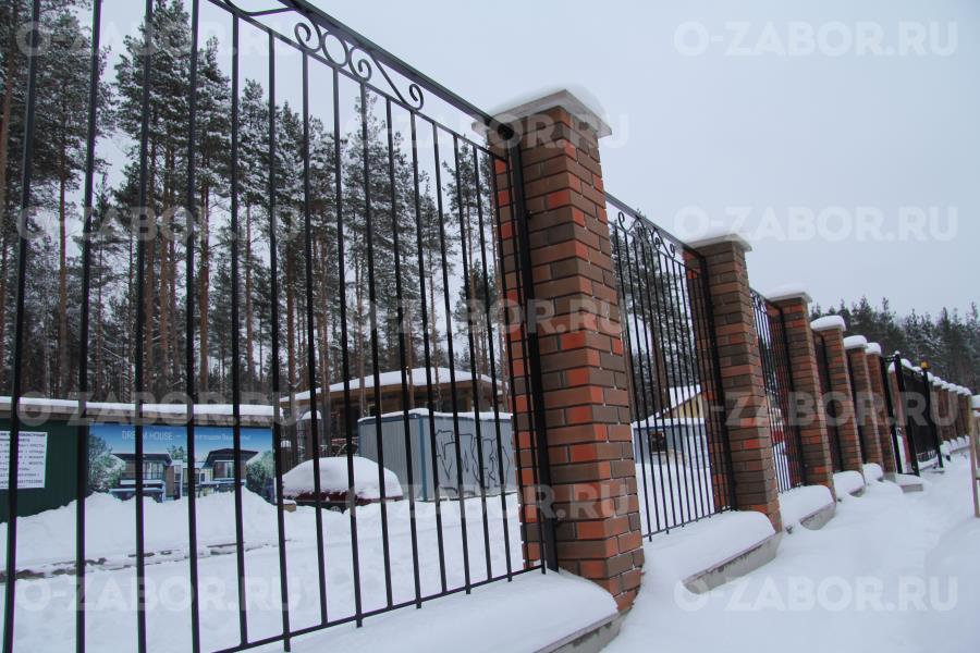 Фасад участка в кирпиче и ажурной ковке на бетонной ленте.